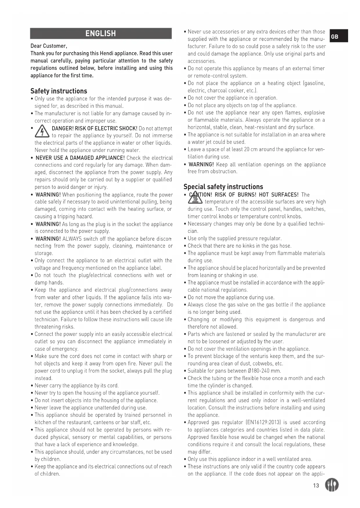 ENGLISH Dear Customer, Thank you for purchasing this Hendi appliance. Read this user manual carefully, paying particular attention to the safety regulations outlined below, before installing and using this appliance for the first time. Safety instructions
