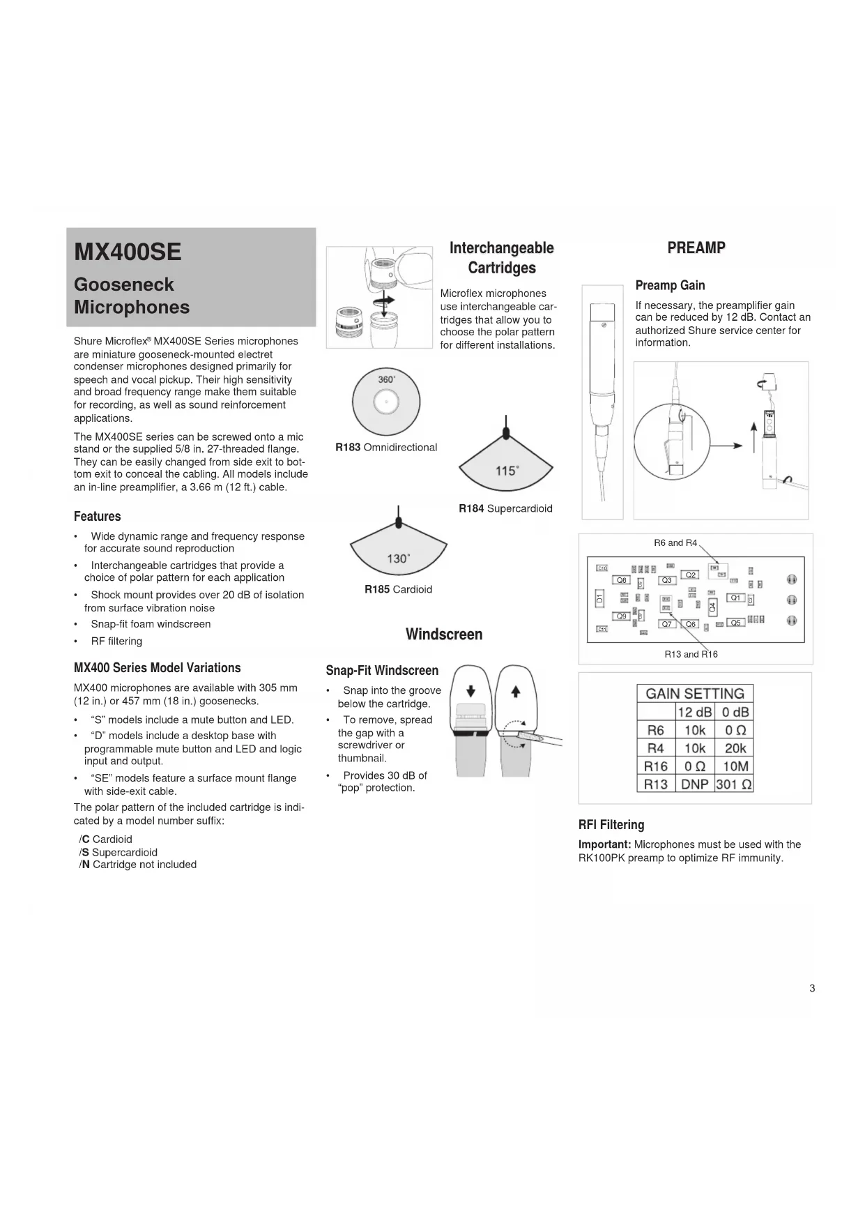 - “SE” models feature a surface mount flange with side-exit cable. The polar pattern of the included cartridge is indi- cated by a model number suffix: /C Cardioid /S Supercardioid /N Cartridge not included MX400SE Interchangeable Cartridges Microflex microphones use interchangeable car- tridges that allow you to choose the polar pattern for different installations. R183 Omnidirectional R184 Supercardioid R185 Cardioid Windscreen Snap-Fit Windscreen