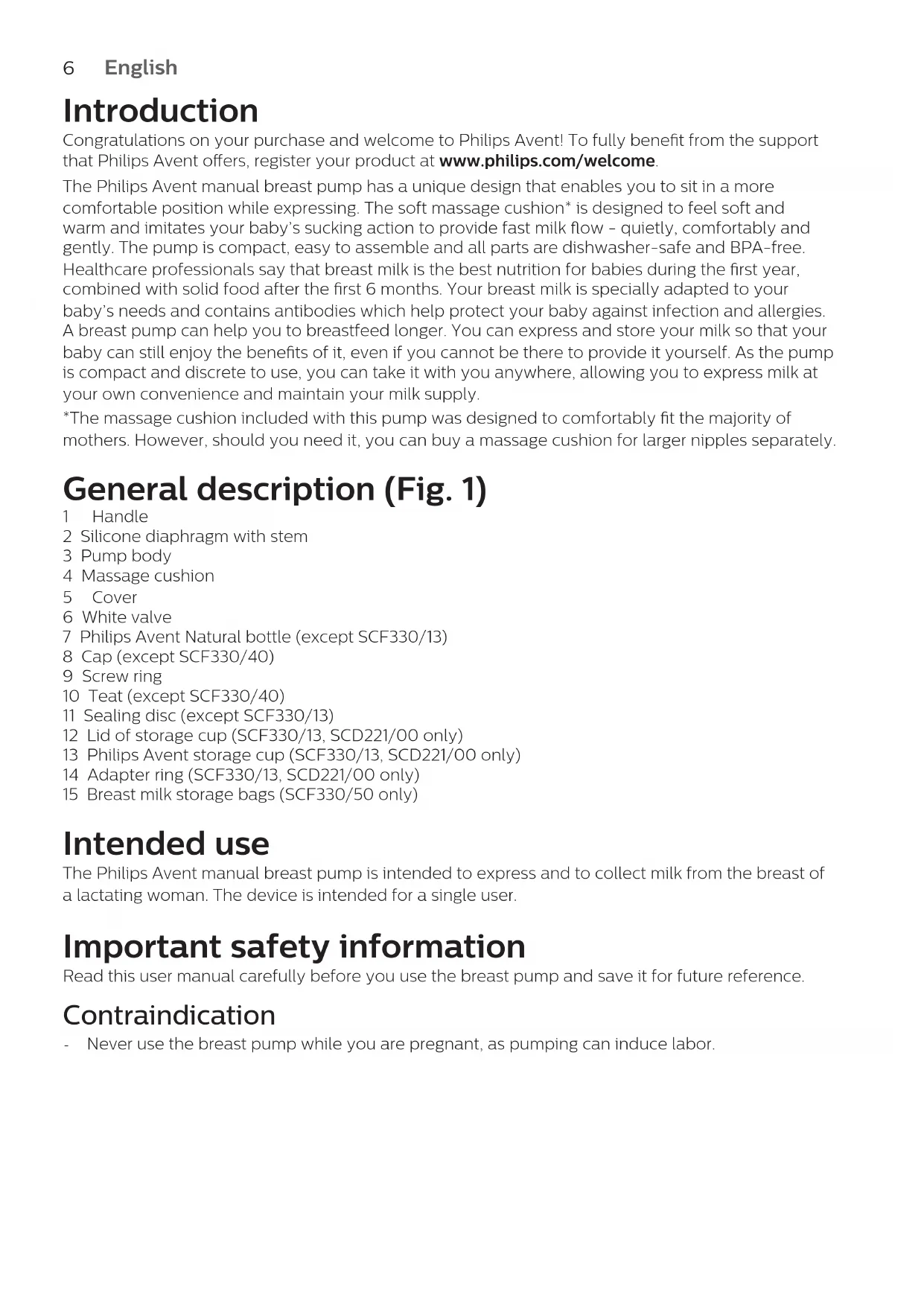 114Introduction Congratulations on your purchase and welcome to Philips Avent! To fully benet from the support that Philips Avent oers, register your product at www.philips.com/welcome. The Philips Avent manual breast pump has a unique design that enables you to sit in a more comfortable position while expressing. The soft massage cushion* is designed to feel soft and warm and imitates your baby’s sucking action to provide fast milk ow - quietly, comfortably and gently. The pump is compact, easy to assemble and all parts are dishwasher-safe and BPA-free. Healthcare professionals say that breast milk is the best nutrition for babies during the rst year, combined with solid food after the rst 6 months. Your breast milk is specially adapted to your baby’s needs and contains antibodies which help protect your baby against infection and allergies. A breast pump can help you to breastfeed longer. You can express and store your milk so that your baby can still enjoy the benets of it, even if you cannot be there to provide it yourself. As the pump is compact and discrete to use, you can take it with you anywhere, allowing you to express milk at your own convenience and maintain your milk supply. *The massage cushion included with this pump was designed to comfortably t the majority of mothers. However, should you need it, you can buy a massage cushion for larger nipples separately. General description (Fig. 1) 1 Handle 2 Silicone diaphragm with stem 3 Pump body 4 Massage cushion 5 Cover 6 White valve 7 Philips Avent Natural bottle (except SCF330/13) 8 Cap (except SCF330/40) 9 Screw ring 10 Teat (except SCF330/40) 11 Sealing disc (except SCF330/13) 12 Lid of storage cup (SCF330/13, SCD221/00 only) 13 Philips Avent storage cup (SCF330/13, SCD221/00 only) 14 Adapter ring (SCF330/13, SCD221/00 only) 15 Breast milk storage bags (SCF330/50 only) Intended use The Philips Avent manual breast pump is intended to express and to collect milk from the breast of a lactating woman. The device is intended for a single user. Important safety information Read this user manual carefully before you use the breast pump and save it for future reference. Contraindication - Never use the breast pump while you are pregnant, as pumping can induce labor.