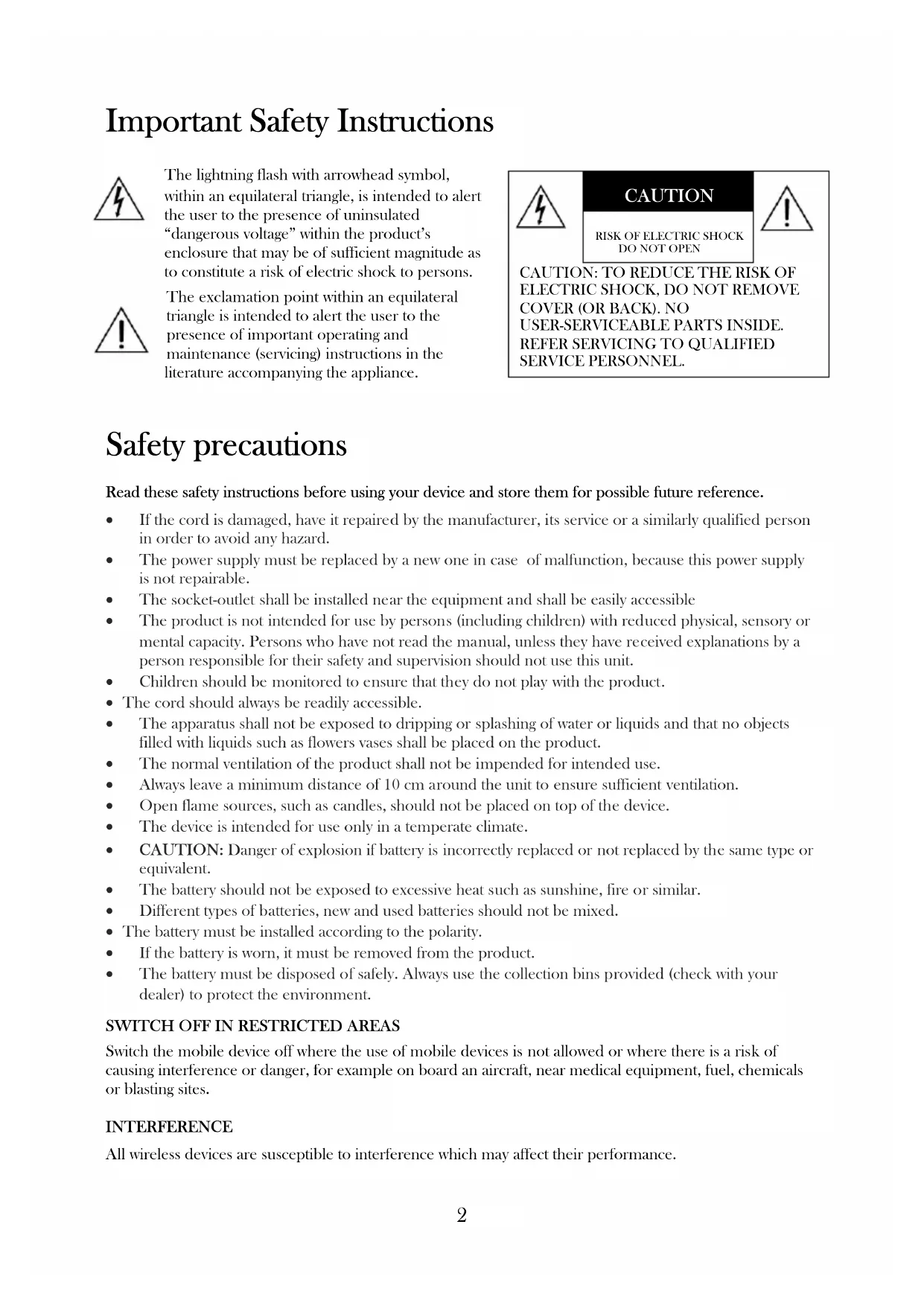 ONDITIONS .............................................................................................. 4Important Safety Instructions The lightning flash with arrowhead symbol, within an equilateral triangle, is intended to alert the user to the presence of uninsulated “dangerous voltage” within the product’s enclosure that may be of sufficient magnitude as to constitute a risk of electric shock to persons. The exclamation point within an equilateral triangle is intended to alert the user to the presence of important operating and maintenance (servicing) instructions in the literature accompanying the appliance. Safety precautions Read these safety instructions before using your device and store them for possible future reference. If the cord is damaged, have it repaired by the manufacturer, its service or a similarly qualified person in order to avoid any hazard. The power supply must be replaced by a new one in case of malfunction, because this power supply is not repairable. The socket-outlet shall be installed near the equipment and shall be easily accessible The product is not intended for use by persons (including children) with reduced physical, sensory or mental capacity. Persons who have not read the manual, unless they have received explanations by a person responsible for their safety and supervision should not use this unit. Children should be monitored to ensure that they do not play with the product. The cord should always be readily accessible. The apparatus shall not be exposed to dripping or splashing of water or liquids and that no objects filled with liquids such as flowers vases shall be placed on the product. The normal ventilation of the product shall not be impended for intended use. Always leave a minimum distance of 10 cm around the unit to ensure sufficient ventilation. Open flame sources, such as candles, should not be placed on top of the device. The device is intended for use only in a temperate climate. CAUTION: Danger of explosion if battery is incorrectly replaced or not replaced by the same type or equivalent. The battery should not be exposed to excessive heat such as sunshine, fire or similar. Different types of batteries, new and used batteries should not be mixed. The battery must be installed according to the polarity. If the battery is worn, it must be removed from the product. The battery must be disposed of safely. Always use the collection bins provided (check with your dealer) to protect the environment.