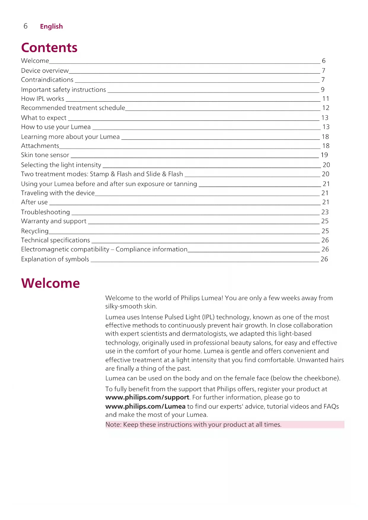 English Contents Welcome__________________________________________________________________________________ 6 Device overview____________________________________________________________________________ 7 Contraindications __________________________________________________________________________ 7 Important safety instructions ________________________________________________________________ 9 How IPL works _____________________________________________________________________________ 11 Recommended treatment schedule___________________________________________________________ 12 What to expect ____________________________________________________________________________ 13 How to use your Lumea _____________________________________________________________________ 13 Learning more about your Lumea ____________________________________________________________ 18 Attachments_______________________________________________________________________________ 18 Skin tone sensor ___________________________________________________________________________ 19 Selecting the light intensity __________________________________________________________________ 20 Two treatment modes: Stamp & Flash and Slide & Flash _________________________________________ 20 Using your Lumea before and after sun exposure or tanning _____________________________________ 21 Traveling with the device____________________________________________________________________ 21 After use __________________________________________________________________________________ 21 Troubleshooting ___________________________________________________________________________ 23 Warranty and support ______________________________________________________________________ 25 Recycling__________________________________________________________________________________ 25 Technical specifications _____________________________________________________________________ 26 Electromagnetic compatibility – Compliance information________________________________________ 26 Explanation of symbols _____________________________________________________________________ 26 Welcome Welcome to the world of Philips Lumea! You are only a few weeks away from silky-smooth skin. Lumea uses Intense Pulsed Light (IPL) technology, known as one of the most effective methods to continuously prevent hair growth. In close collaboration with expert scientists and dermatologists, we adapted this light-based technology, originally used in professional beauty salons, for easy and effective use in the comfort of your home. Lumea is gentle and offers convenient and effective treatment at a light intensity that you find comfortable. Unwanted hairs are finally a thing of the past. Lumea can be used on the body and on the female face (below the cheekbone). To fully benefit from the support that Philips offers, register your product at www.philips.com/support. For further information, please go to www.philips.com/Lumea to find our experts' advice, tutorial videos and FAQs and make the most of your Lumea. Note: Keep these instructions with your product at all times.7 English Device overview 1 Light exit window (with integrated UV filter) 2 Attachments a Body attachment b Face attachment (SC1997, SC1998 and SC1999) c Bikini attachment (SC1998, SC1999) 3 Reflector inside the attachment 4 Integrated safety system 5 Skin tone sensor 6 Electronic contacts 7 Flash button 8 Opening for electronic contacts 9 On/off and light intensity setting button 10 Intensity lights 11 'READY to flash' light 12 Air vents 13 Device socket 14 Adapter 15 Small plug 16 Pouch (not shown) 17 Cleaning cloth (not shown) Contraindications Conditions Never use the device: