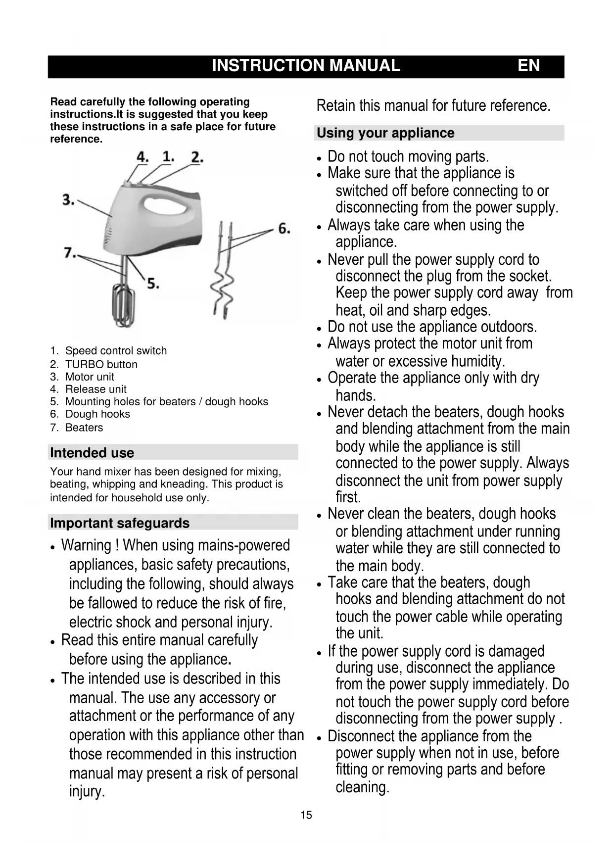 Your hand mixer has been designed for mixing, beating, whipping and kneading. This product is intended for household use only.