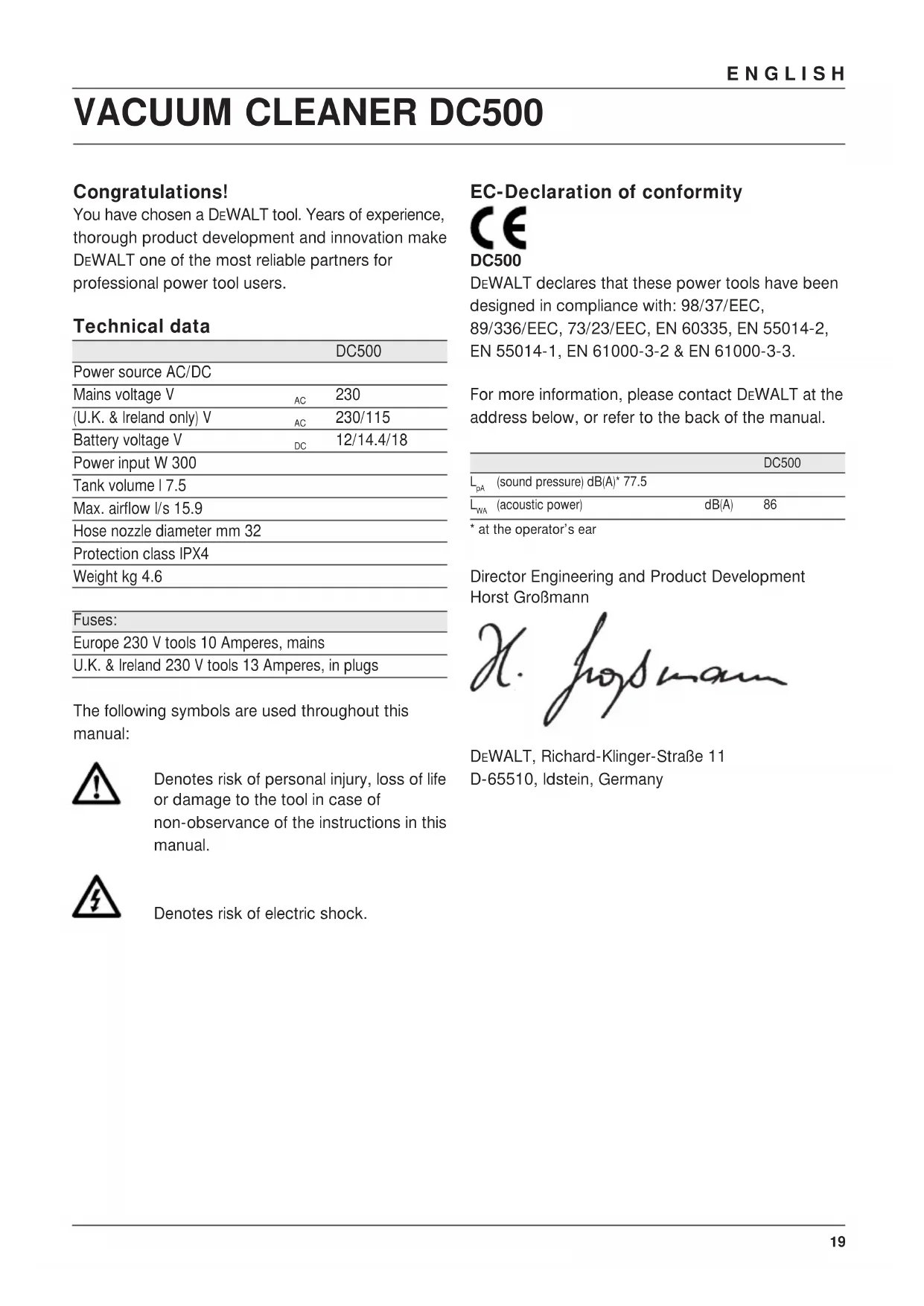12/14.4/18 Power input W 300 Tank volume l 7.5 Max. airflow l/s 15.9 Hose nozzle diameter mm 32 Protection class IPX4 Weight kg 4.6 Fuses: Europe 230 V tools 10 Amperes, mains U.K. & Ireland 230 V tools 13 Amperes, in plugs The following symbols are used throughout this manual: Denotes risk of personal injury, loss of life or damage to the tool in case of non-observance of the instructions in this manual. Denotes risk of electric shock. EC-Declaration of conformity DC500 DEWALT declares that these power tools have been designed in compliance with: 98/37/EEC, 89/336/EEC, 73/23/EEC, EN 60335, EN 55014-2, EN 55014-1, EN 61000-3-2 & EN 61000-3-3. For more information, please contact DEWALT at the address below, or refer to the back of the manual. DC500