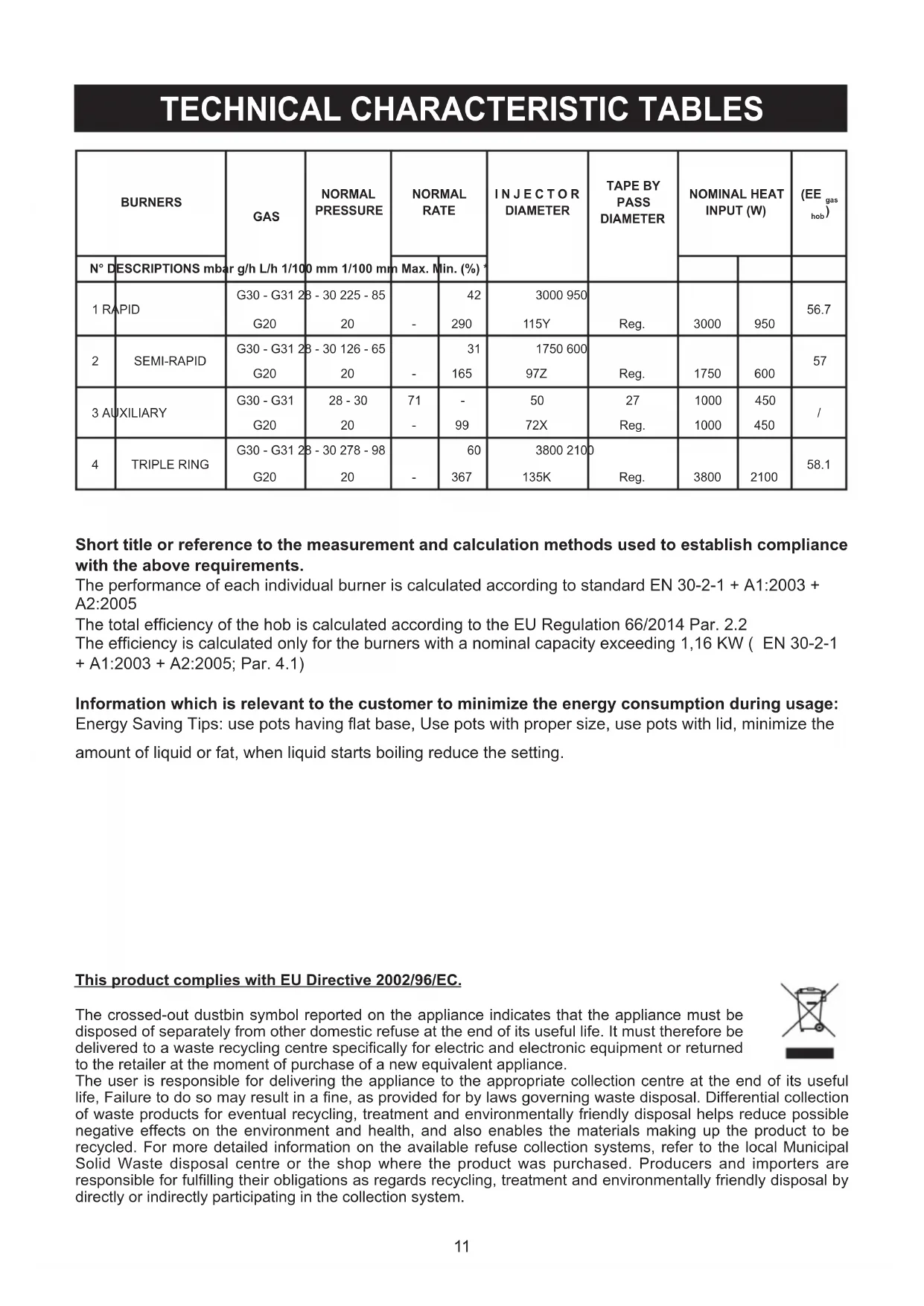 G20 20 - 367 135K Reg. 3800 2100 This product complies with EU Directive 2002/96/EC. The crossed-out dustbin symbol reported on the appliance indicates that the appliance must be disposed of separately from other domestic refuse at the end of its useful life. It must therefore be delivered to a waste recycling centre specifically for electric and electronic equipment or returned to the retailer at the moment of purchase of a new equivalent appliance. The user is responsible for delivering the appliance to the appropriate collection centre at the end of its useful life, Failure to do so may result in a fine, as provided for by laws governing waste disposal. Differential collection of waste products for eventual recycling, treatment and environmentally friendly disposal helps reduce possible negative effects on the environment and health, and also enables the materials making up the product to be recycled. For more detailed information on the available refuse collection systems, refer to the local Municipal Solid Waste disposal centre or the shop where the product was purchased. Producers and importers are responsible for fulfilling their obligations as regards recycling, treatment and environmentally friendly disposal by directly or indirectly participating in the collection system. Short title or reference to the measurement and calculation methods used to establish compliance with the above requirements. The performance of each individual burner is calculated according to standard EN 30-2-1 + A1:2003 + A2:2005 The total efciency of the hob is calculated according to the EU Regulation 66/2014 Par. 2.2 The efciency is calculated only for the burners with a nominal capacity exceeding 1,16 KW ( EN 30-2-1 + A1:2003 + A2:2005; Par. 4.1) Information which is relevant to the customer to minimize the energy consumption during usage: Energy Saving Tips: use pots having at base, Use pots with proper size, use pots with lid, minimize the amount of liquid or fat, when liquid starts boiling reduce the setting.12