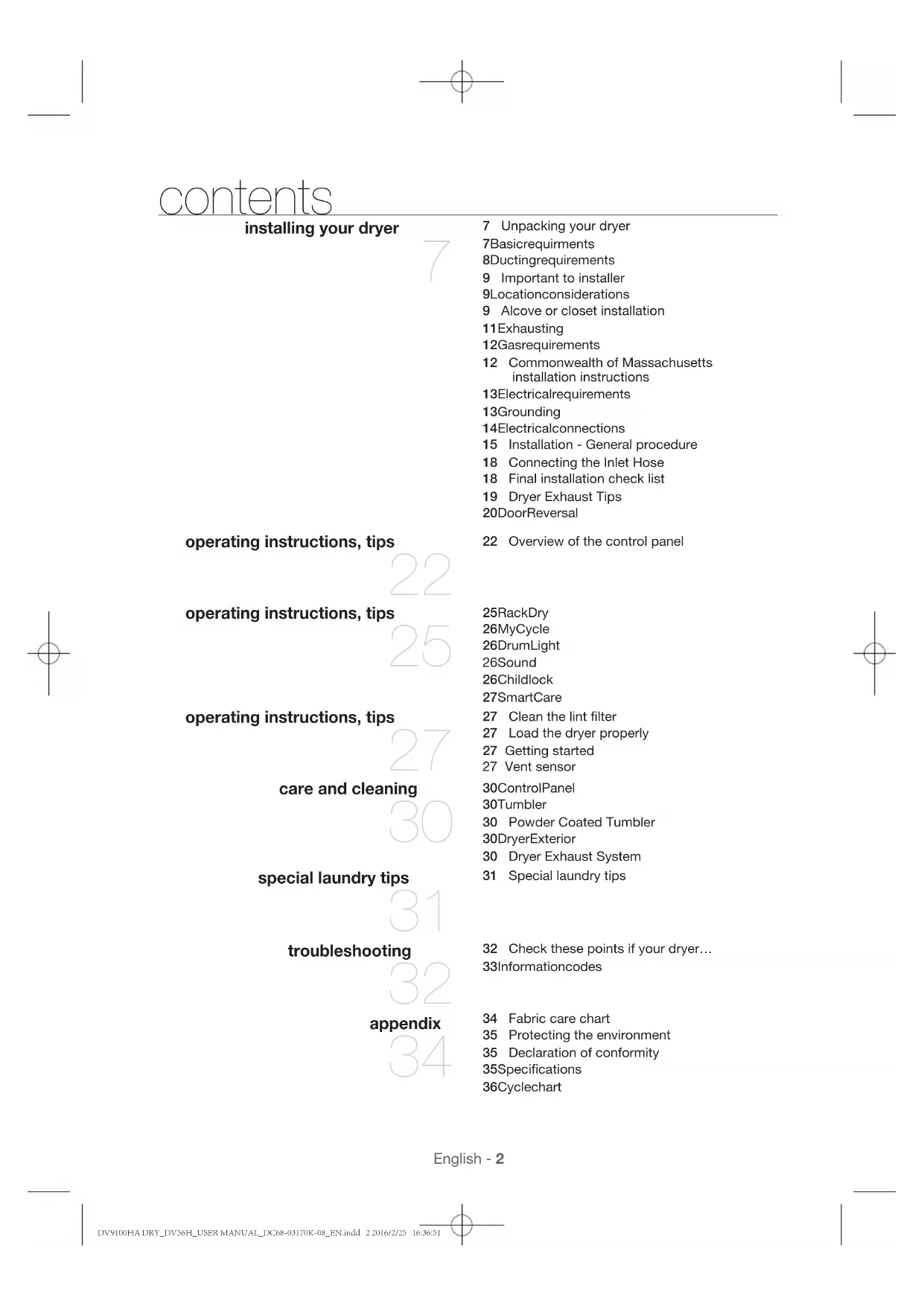 Gas and Electric Dryer user manual imagine the possibilities Thank you for purchasing this Samsung product. DV56H9100E* DV56H9100G* DV9100HA DRY_DV56H_USER MANUAL_DC68-03170K-08_EN.indd 1 2016/2/25 16:36:51English - 2 contents installing your dryer