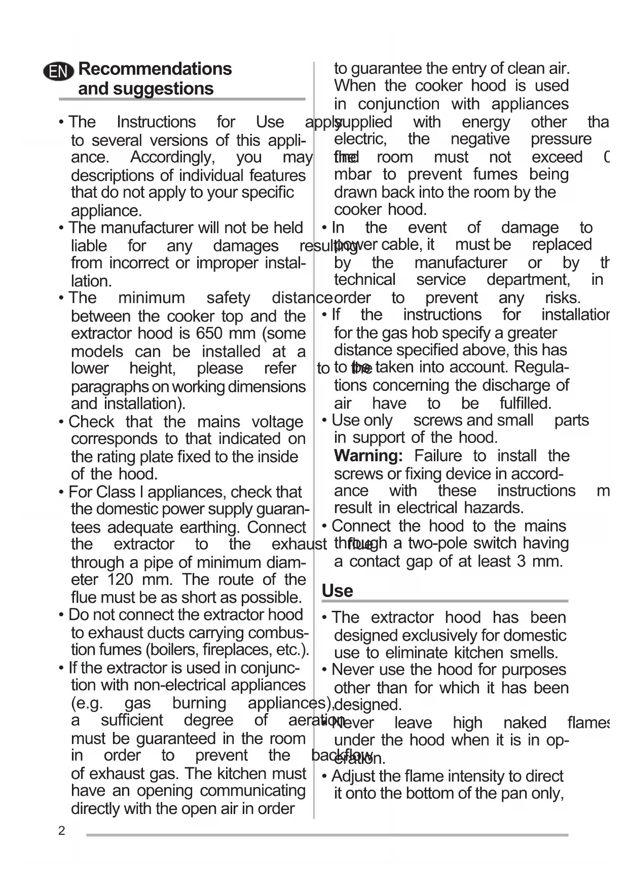 - Iftheextractorisusedinconjunc- tion with non-electrical appliances (e.g. gas burning appliances), a sufcient degree of aeration must be guaranteed in the room in order to prevent the backow of exhaust gas. The kitchen must have an opening communicating directlywiththeopenairinorder toguaranteetheentryofcleanair. When the cooker hood is used in conjunction with appliances supplied with energy other than electric, the negative pressure in the room must not exceed 0,04 mbar to prevent fumes being drawnbackintotheroombythe cooker hood.
