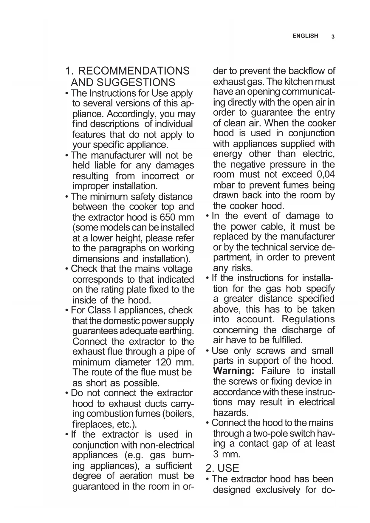 - For Class I appliances, check that the domestic power supply guarantees adequate earthing. Connect the extractor to the exhaust ue through a pipe of minimum diameter 120 mm. The route of the ue must be as short as possible.