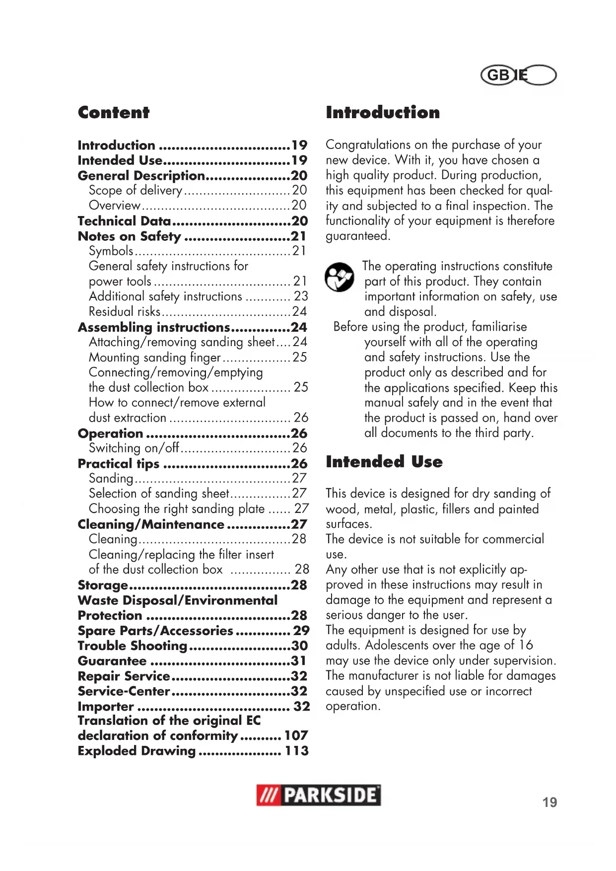 Guarantee Dear Customer, This equipment is provided with a 3-year guarantee from the date of purchase. In case of defects, you have statutory rights against the seller of the product. These statutory rights are not restricted by our guarantee presented below. Terms of Guarantee The term of the guarantee begins on the date of purchase. Please retain the original receipt. This document is required as proof of purchase. If a material or manufacturing defect occurs within three years of the date of purchase of this product, we will repair or replace – at our choice – the product for you free of charge. This guarantee requires the defective equipment and proof of pur- chase to be presented within the three-year period with a brief written description of what constitutes the defect and when it oc- curred. If the defect is covered by our guarantee, you will receive either the repaired product or a new product. No new guarantee pe- riod begins on repair or replacement of the product. Guarantee Period and Statutory Claims for Defects The guarantee period is not extended by the guarantee service. This also applies for replaced or repaired parts. Any damages and defects already present at the time of purchase must be reported immediately af- ter unpacking. Repairs arising after expiry of the guarantee period are chargeable. Guarantee Cover The equipment has been carefully pro- duced in accordance with strict quality guidelines and conscientiously checked prior to delivery. The guarantee applies for all material and manufacturing defects. This guarantee does not extend to cover product parts that are subject to normal wear and may there- fore be considered as wearing parts (e.g. tools, sanding sheets) or to cover damage to breakable parts (e.g. switches). This guarantee shall be invalid if the prod- uct has been damaged, used incorrectly or not maintained. Precise adherence to all of