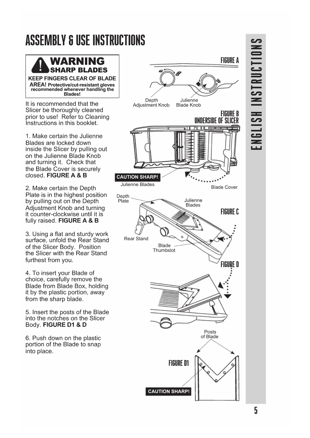 CAUTION: Once the Blades are removed, DO NOT immerse them in water! Blades should be washed either in a top rack of the dishwasher or by holding onto the plastic portion of the Blade. With a soapy towel, wipe AWAY from the Blade edges. To rinse Blade, hold by the Handle and wipe with a clean, damp towel, or hold under running water. Dry thoroughly. - Store the Blades in the accompanying Blade Box. Return the Slicer and all parts to the original box. Store in a cool, dry area. BE SURE TO STORE OUT OF REACH OF CHILDREN!