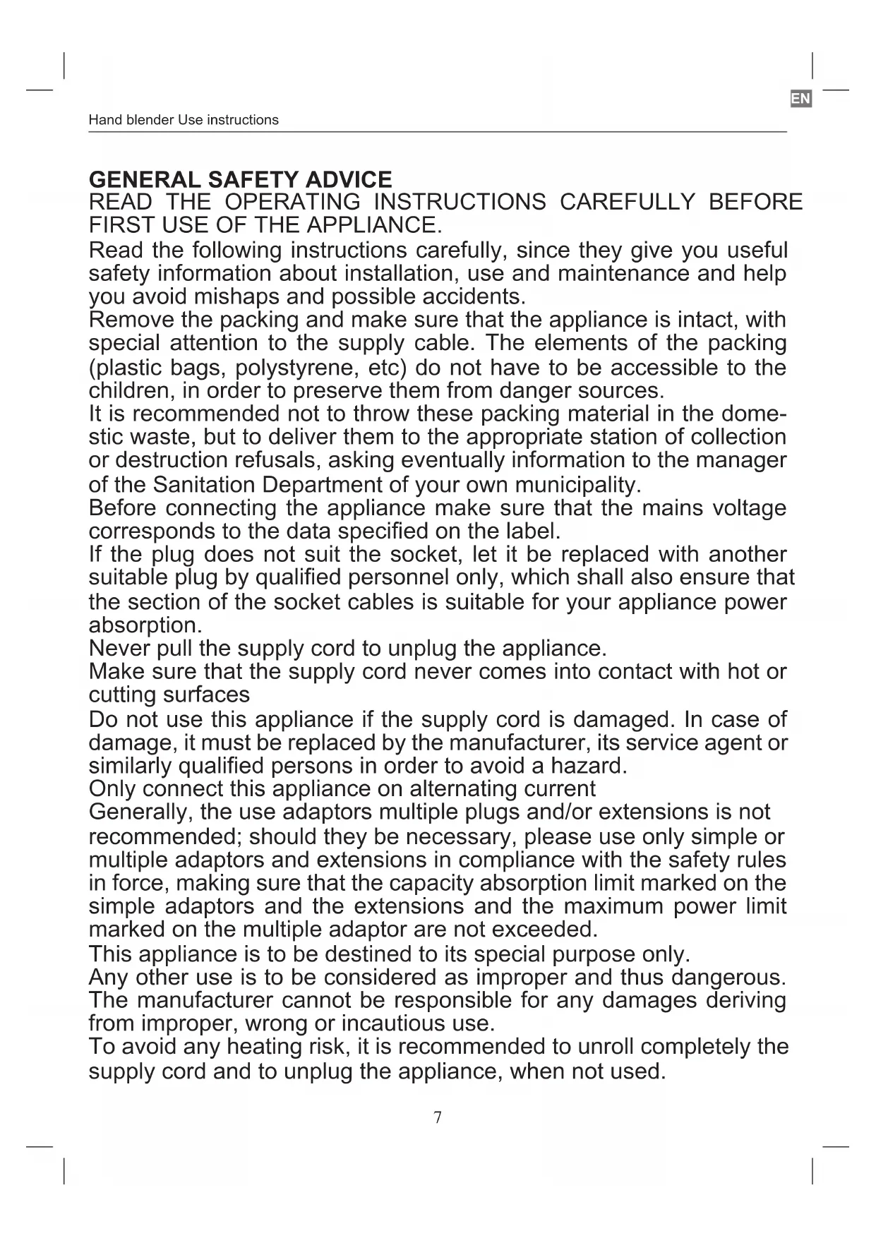 Before using the hand blender check the integrity of the appliance and cord supply.