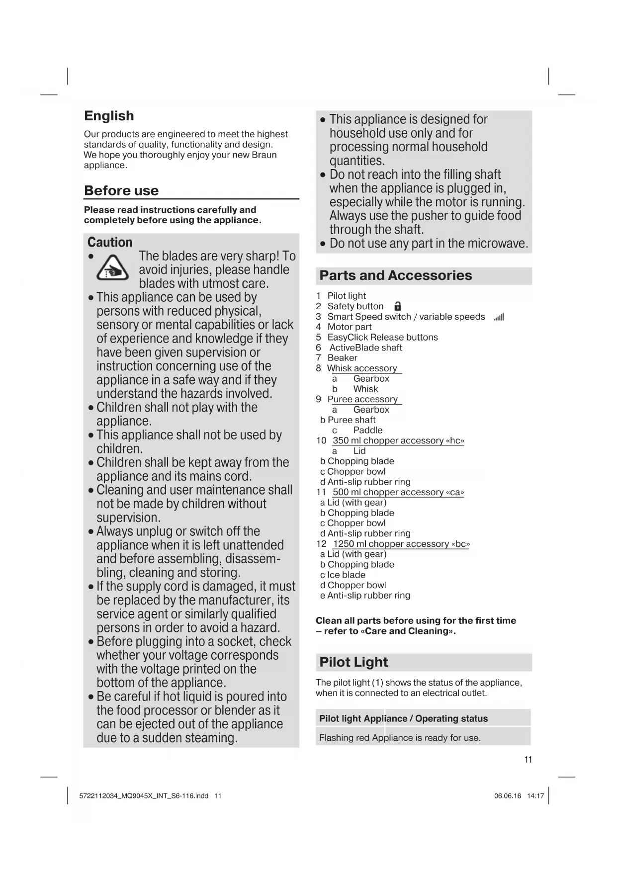 Do not use any part in the microwave. Parts and Accessories 1 Pilot light 2 Safety button 3 Smart Speed switch / variable speeds 4 Motor part 5 EasyClick Release buttons 6 ActiveBlade shaft 7 Beaker 8 Whisk accessory a Gearbox b Whisk 9 Puree accessory a Gearbox b Puree shaft c Paddle 10 350 ml chopper accessory «hc» a Lid b Chopping blade c Chopper bowl d Anti-slip rubber ring 11 500 ml chopper accessory «ca» a Lid (with gear) b Chopping blade c Chopper bowl d Anti-slip rubber ring 12 1250 ml chopper accessory «bc» a Lid (with gear) b Chopping blade c Ice blade d Chopper bowl e Anti-slip rubber ring Clean all parts before using for the first time – refer to «Care and Cleaning». Pilot Light The pilot light (1) shows the status of the appliance, when it is connected to an electrical outlet. Pilot light Appliance / Operating status Flashing red Appliance is ready for use. 5722112034_MQ9045X_INT_S6-116.indd 115722112034_MQ9045X_INT_S6-116.indd 11 06.06.16 14:1706.06.16 14:1712 Solid green Appliance is released (switch re- lease button is pressed) and can be switched on. Solid Red Early warning about overheating. Motor slows down, step by step, till shut off . Let the device cool down. It is ready for use again when the pilot light fl ashes red. If the maximum speed decreases under high load and long running time you can still finish your preparation, however you should let the appliance cool down afterwards. How to Use the Appliance Smart Speed Switch for Variable Speeds One squeeze, all speeds. The more you press, the higher the speed. The higher the speed, the faster and finer the blending and chopping results. One handed operation: the Smart Speed switch (3) allows you to turn on the appliance and control the speed with one hand. Operating your Hand Blender First use: Remove the transportation lock from the motor part (4) by pulling it at the red strap. Switching On (A) The appliance comes equipped with a safety button for releasing the Smart Speed switch. To safely turn it on, follow these points: