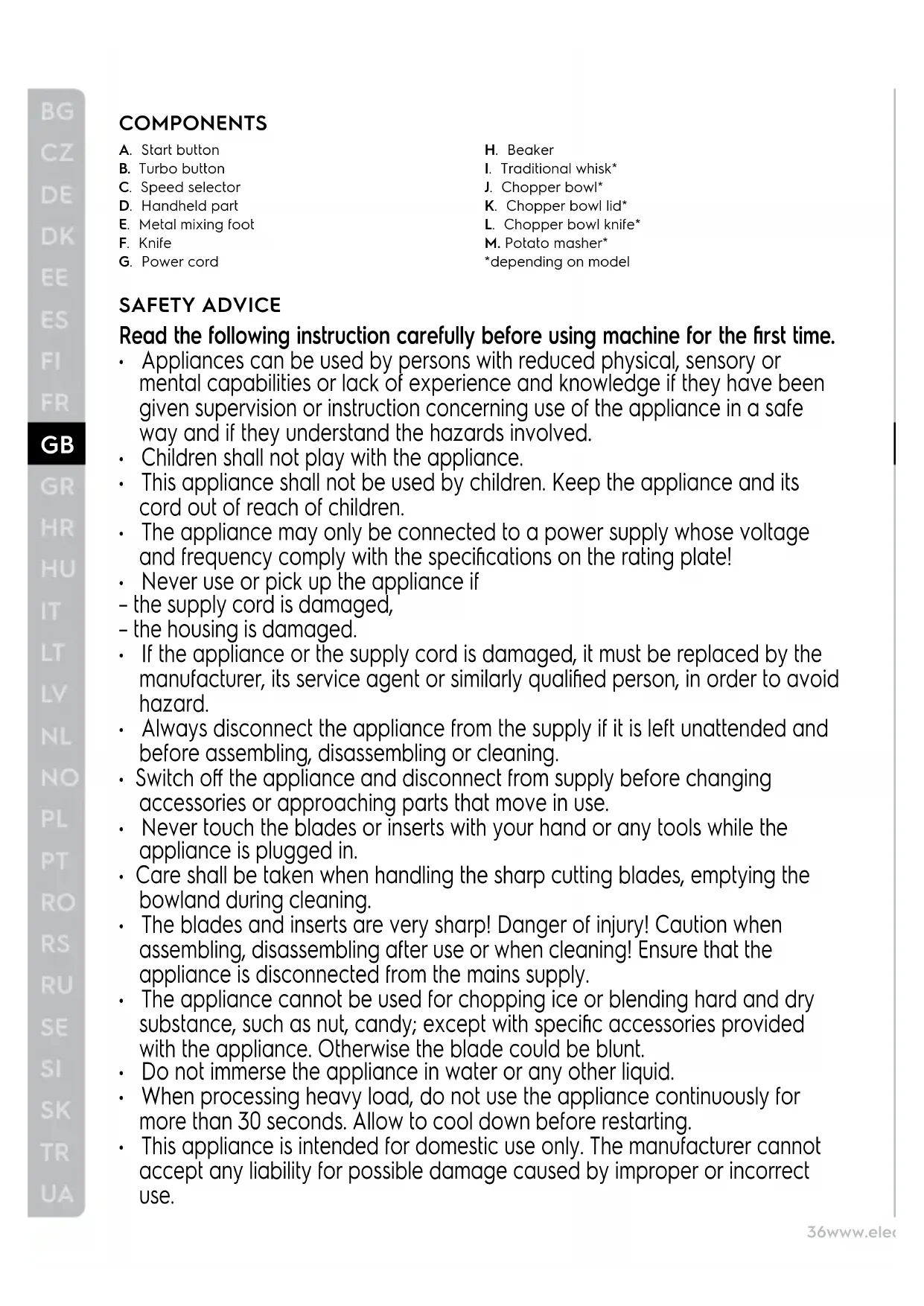 J. Chopper bowl* K. Chopper bowl lid* L. Chopper bowl knife* M. Potato masher* *depending on model SAFETY ADVICE Read the following instruction carefully before using machine for the first time.