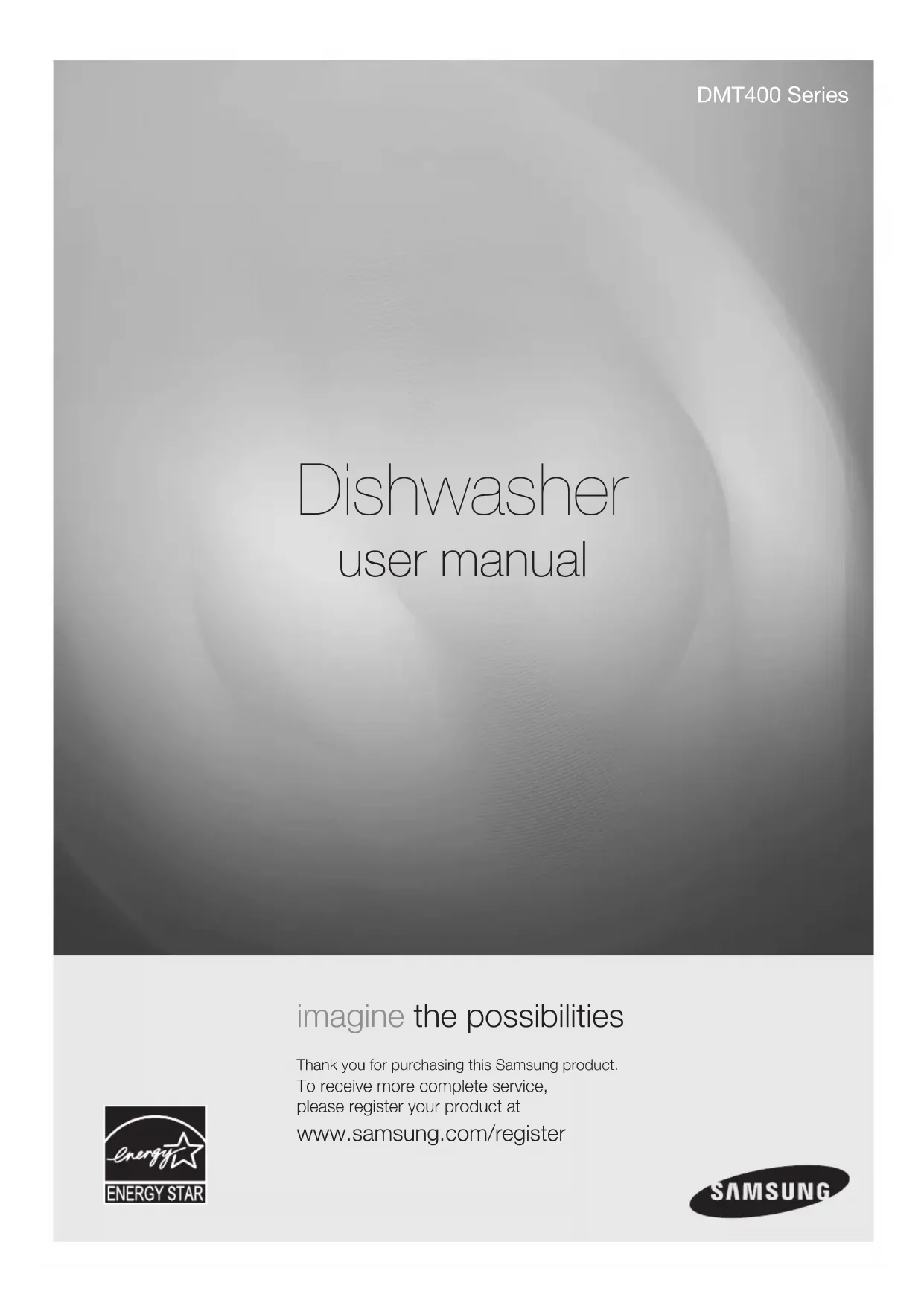 Dishwasher user manual imagine the possibilities Thank you for purchasing this Samsung product. To receive more complete service, please register your product at www.samsung.com/register DMT400 Series DMT400_DD68-00074A.indb 1 2010-07-09 11:28:072_ features of your new samsung dishwasher features of your new samsung dishwasher Your new Samsung Dishwasher will change the way you feel about doing dishes. From its extra large capacity to its energy efficiency, your new Samsung dishwasher has all the features to make your chores much less mundane.