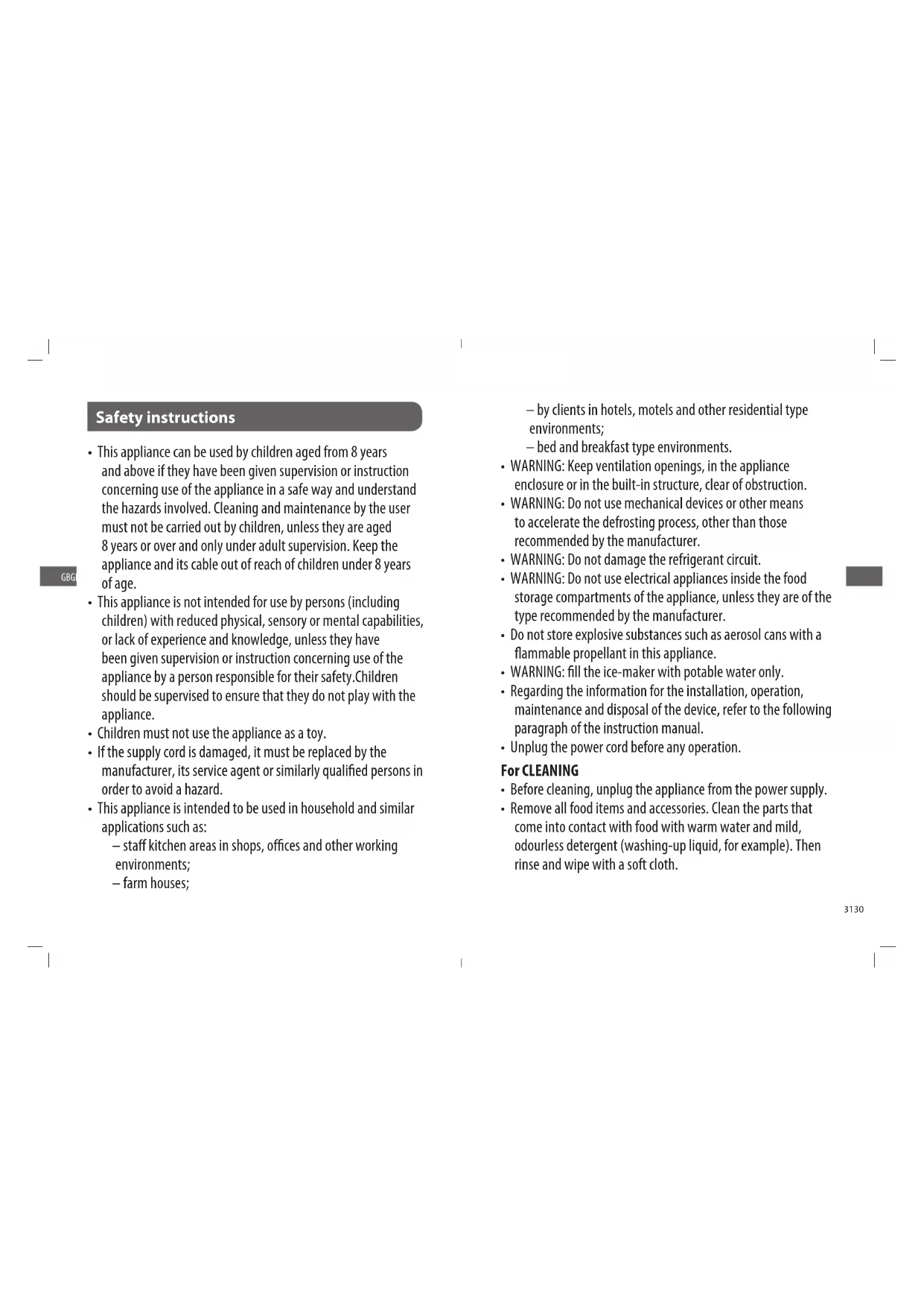 GB GBAccessories Energy label FR/ENG manual Ice box Egg tray Ice scraper Disposal The refrigerating gas contained in the circuit of this appliance is isobutane (R600a); it causes a low level of pollution but is inammable. Please contact your local disposal department for advice on the correct method of disposal. Troubleshooting Before calling for service please check the following. THE APPLIANCE IS NOT WORKING. Check the plug is inserted correctly into the mains socket. Check there is power to the mains socket by plugging another appliance in, if the other appliance do not work either, check the fuse in the plug. THE APPLIANCE IS NOISY WHEN OPERATING. Check the appliance is level and it is not in contact with another appliance or kitchen furniture. THE APPLIANCE DOES NOT COOL SUFFICIENTLY. If the door has been opened too often or it has been left open for a while it will take time for the appliance to reach its set temperature. Check the airow over the rear of the appliance has not been reduced due to insucient clearance. Check if a large quantity of fresh food has been introduced.