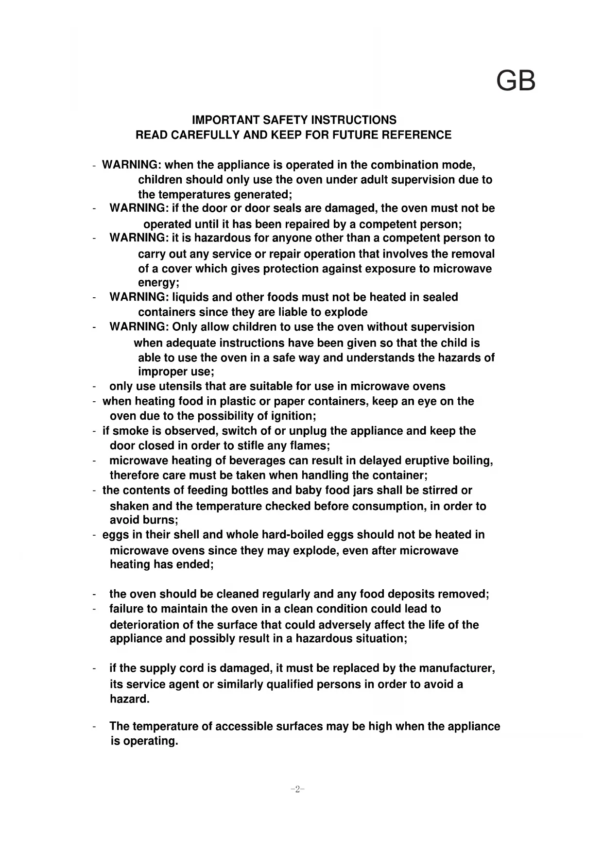 READ CAREFULLY AND KEEP FOR FUTURE REFERENCE - WARNING: when the appliance is operated in the combination mode, children should only use the oven under adult supervision due to the temperatures generated; - WARNING: if the door or door seals are damaged, the oven must not be operated until it has been repaired by a competent person; - WARNING: it is hazardous for anyone other than a competent person to carry out any service or repair operation that involves the removal of a cover which gives protection against exposure to microwave energy; - WARNING: liquids and other foods must not be heated in sealed containers since they are liable to explode - WARNING: Only allow children to use the oven without supervision when adequate instructions have been given so that the child is able to use the oven in a safe way and understands the hazards of improper use; - only use utensils that are suitable for use in microwave ovens - when heating food in plastic or paper containers, keep an eye on the oven due to the possibility of ignition; - if smoke is observed, switch of or unplug the appliance and keep the door closed in order to stifle any flames; - microwave heating of beverages can result in delayed eruptive boiling, therefore care must be taken when handling the container; - the contents of feeding bottles and baby food jars shall be stirred or shaken and the temperature checked before consumption, in order to avoid burns; - eggs in their shell and whole hard-boiled eggs should not be heated in microwave ovens since they may explode, even after microwave heating has ended; - the oven should be cleaned regularly and any food deposits removed; - failure to maintain the oven in a clean condition could lead to deterioration of the surface that could adversely affect the life of the appliance and possibly result in a hazardous situation; - if the supply cord is damaged, it must be replaced by the manufacturer, its service agent or similarly qualified persons in order to avoid a hazard. GBSPECIFICATIONS Power consumption: Output: Grill Heater: Operating Frequency: Outside Dimensions: Oven Cavity Dimensions: Oven Capacity: Uncrated Weight: 230V~50Hz,1280W 800W 1100W 2,450MHz 470mm(W) X 397mm(D) X 282mm(H) 315mm(W) X 330mm(D) X 195mm(H) 22litres Approx. 1 2 .2kg IF NONE OF THE ABOVE RECTIFIES THE SITUATION, THEN CONTACT THE AUTHORIZED SERVICE AGENT.