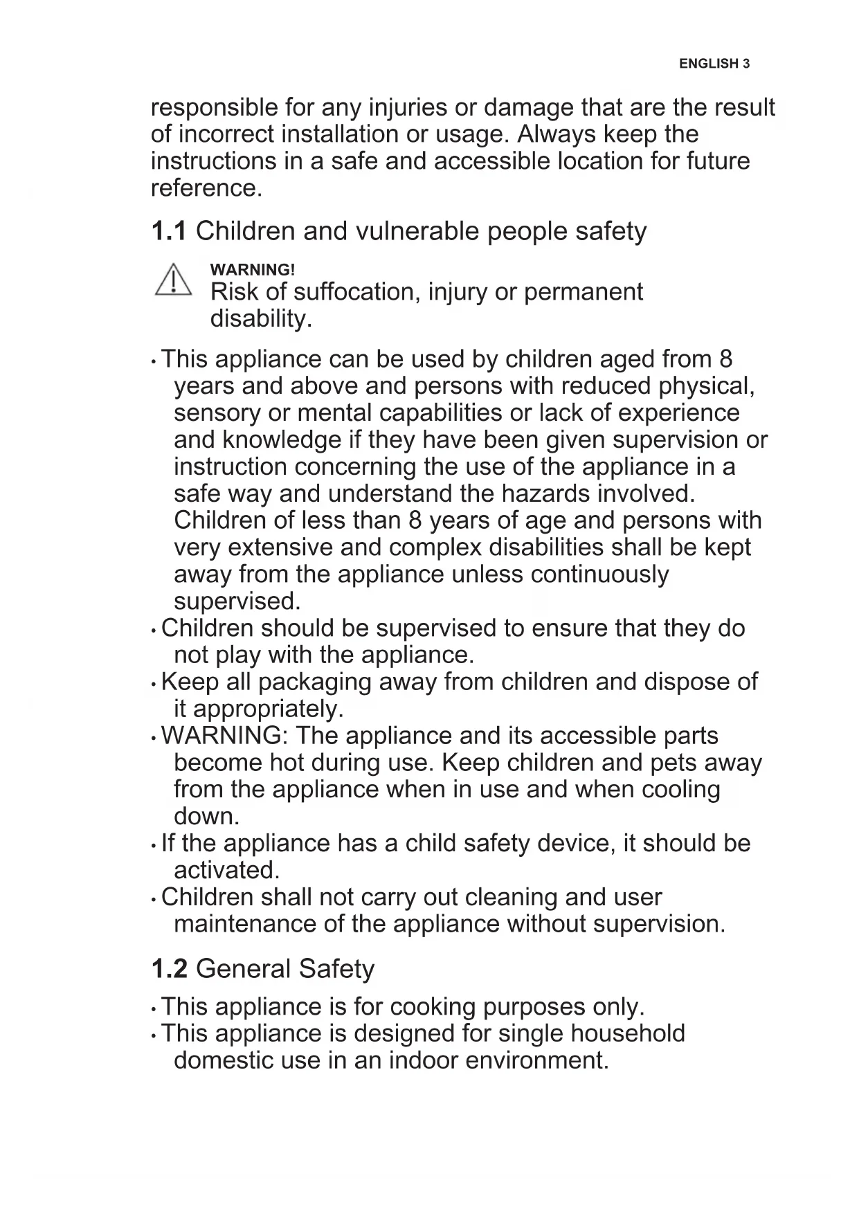 - This appliance is designed for single household domestic use in an indoor environment. ENGLISH 3• This appliance may be used in, offices, hotel guest rooms, bed & breakfast guest rooms, farm guest houses and other similar accommodation where such use does not exceed (average) domestic usage levels.