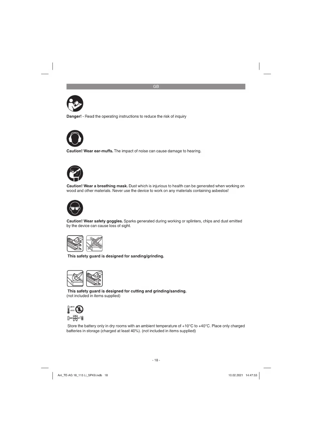 Danger! - Read the operating instructions to reduce the risk of inquiry Caution! Wear ear-muff s. The impact of noise can cause damage to hearing. Caution! Wear safety goggles. Sparks generated during working or splinters, chips and dust emitted by the device can cause loss of sight. Caution! Wear a breathing mask. Dust which is injurious to health can be generated when working on wood and other materials. Never use the device to work on any materials containing asbestos! Store the battery only in dry rooms with an ambient temperature of +10°C to +40°C. Place only charged batteries in storage (charged at least 40%). (not included in items supplied) This safety guard is designed for cutting and grinding/sanding. (not included in items supplied) This safety guard is designed for sanding/grinding. Anl_TE-AG 18_115 Li_SPK9.indb 18Anl_TE-AG 18_115 Li_SPK9.indb 18 10.02.2021 14:47:5310.02.2021 14:47:53GB