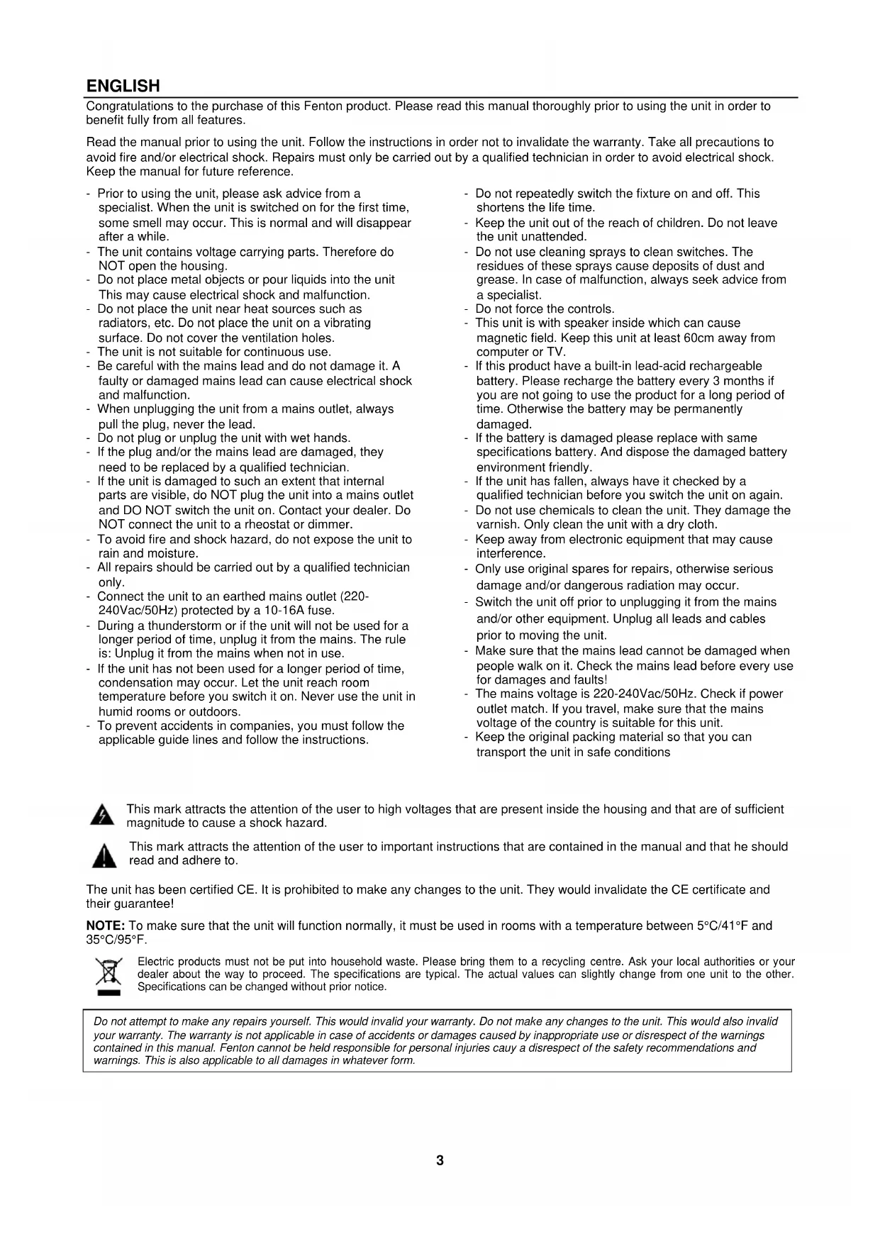 This mark attracts the attention of the user to high voltages that are present inside the housing and that are of sufficient magnitude to cause a shock hazard. This mark attracts the attention of the user to important instructions that are contained in the manual and that he should read and adhere to. The unit has been certified CE. It is prohibited to make any changes to the unit. They would invalidate the CE certificate and their guarantee! NOTE: To make sure that the unit will function normally, it must be used in rooms with a temperature between 5°C/41°F and 35°C/95°F. Electric products must not be put into household waste. Please bring them to a recycling centre. Ask your local authorities or your dealer about the way to proceed. The specifications are typical. The actual values can slightly change from one unit to the other. Specifications can be changed without prior notice. Do not attempt to make any repairs yourself. This would invalid your warranty. Do not make any changes to the unit. This would also invalid your warranty. The warranty is not applicable in case of accidents or damages caused by inappropriate use or disrespect of the warnings contained in this manual. Fenton cannot be held responsible for personal injuries cauy a disrespect of the safety recommendations and warnings. This is also applicable to all damages in whatever form.4 UNPACKING INSTRUCTION CAUTION! Carefully unpack the box upon receipt. Check the contents to ensure that all parts are present and have been received in good condition. Notify the shipper immediately and retain packaging material if any parts appear damaged from shipping or the package itself shows signs of mishandling. Save the package and all packaging materials. If the product must be returned, it is important that the product is returned in the original factory box and packaging. If the device has been exposed to drastic temperature fluctuation (e.g. after transportation), do not switch it on immediately. The arising condensation water might damage your device. Leave the device switched off until it has reached room temperature. POWERSUPPLY The label on the back/under side of the product indicates the mains voltage to which it must be connected. Check that the mains voltage corresponds to this. Any other voltage than the one indicated may cause irreparable damage to the unit. The unit must also be connected directly to the mains voltage and no dimmer or adjustable power supply may be used. Always connect the device to a protected circuit (circuit breaker or fuse). Make sure the device has an appropriate electrical ground to avoid the risk of electrocution or fire.