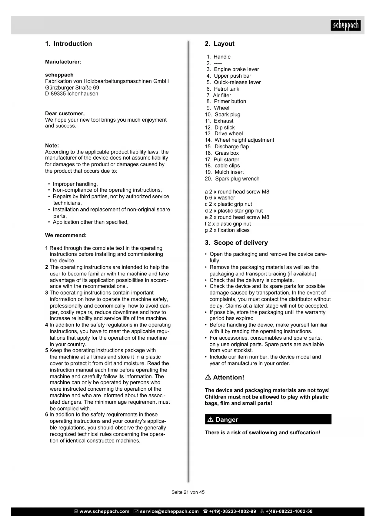 - Include our item number, the device model and year of manufacture in your order. m Attention! The device and packaging materials are not toys! Children must not be allowed to play with plastic bags, lm and small parts! m Danger There is a risk of swallowing and suffocation!Seite 22 von 45 www.scheppach.com service@scheppach.com +(49)-08223-4002-99 +(49)-08223-4002-58