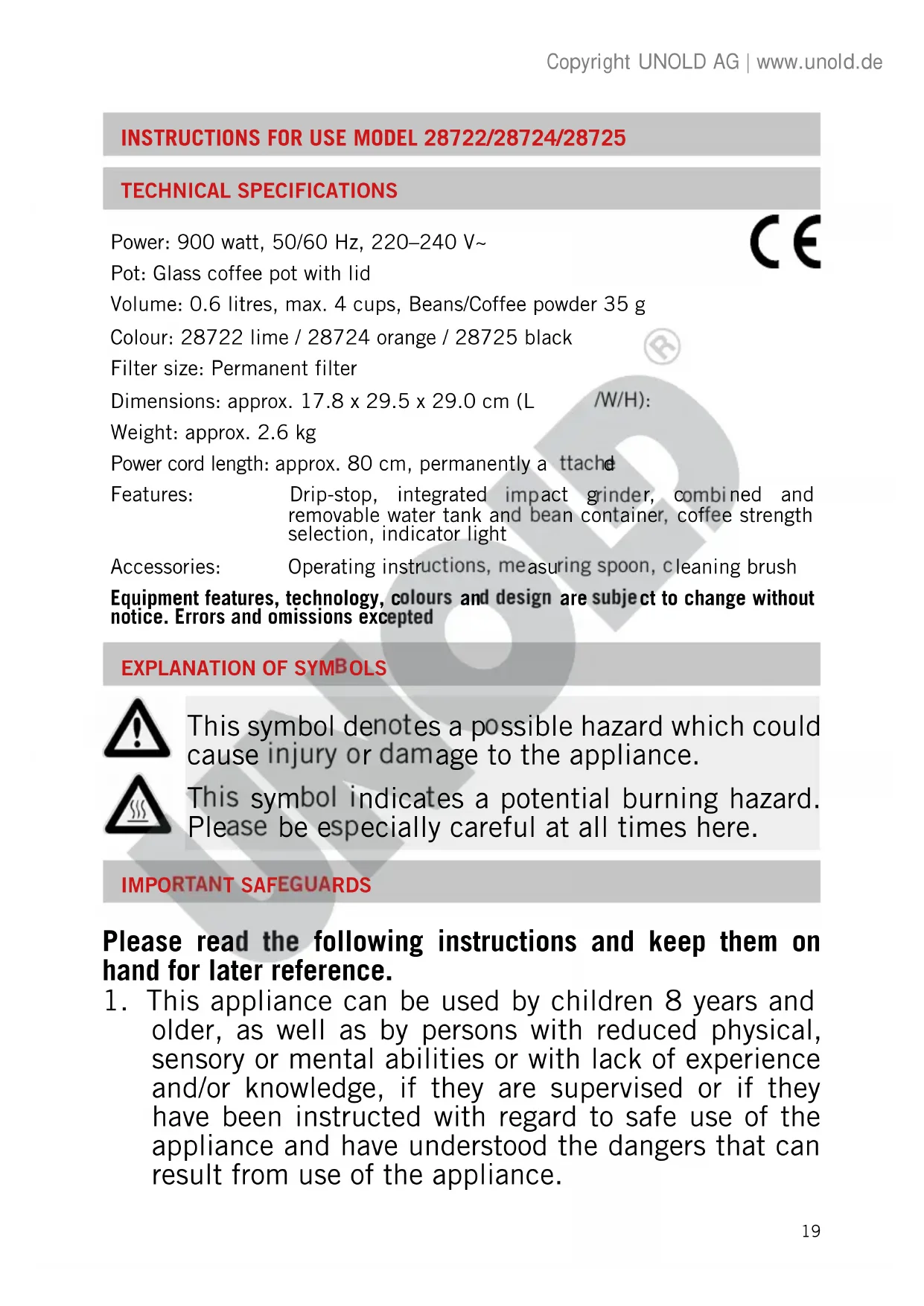 older, as well as by persons with reduced physical, sensory or mental abilities or with lack of experience and/or knowledge, if they are supervised or if they have been instructed with regard to safe use of the appliance and have understood the dangers that can result from use of the appliance. Power: 900 watt, 50/60 Hz, 220–240 V~ Pot: Glass coffee pot with lid Volume: 0.6 litres, max. 4 cups, Beans/Coffee powder 35 g Colour: 28722 lime / 28724 orange / 28725 black Filter size: Permanent filter Dimensions: approx. 17.8 x 29.5 x 29.0 cm (L/W/H): Weight: approx. 2.6 kg Power cord length: approx. 80 cm, permanently attached Features: Drip-stop, integrated impact grinder, combined and removable water tank and bean container, coffee strength selection, indicator light Accessories: Operating instructions, measuring spoon, cleaning brush Equipment features, technology, colours and design are subject to change without notice. Errors and omissions excepted Copyright UNOLD AG | www.unold.de20