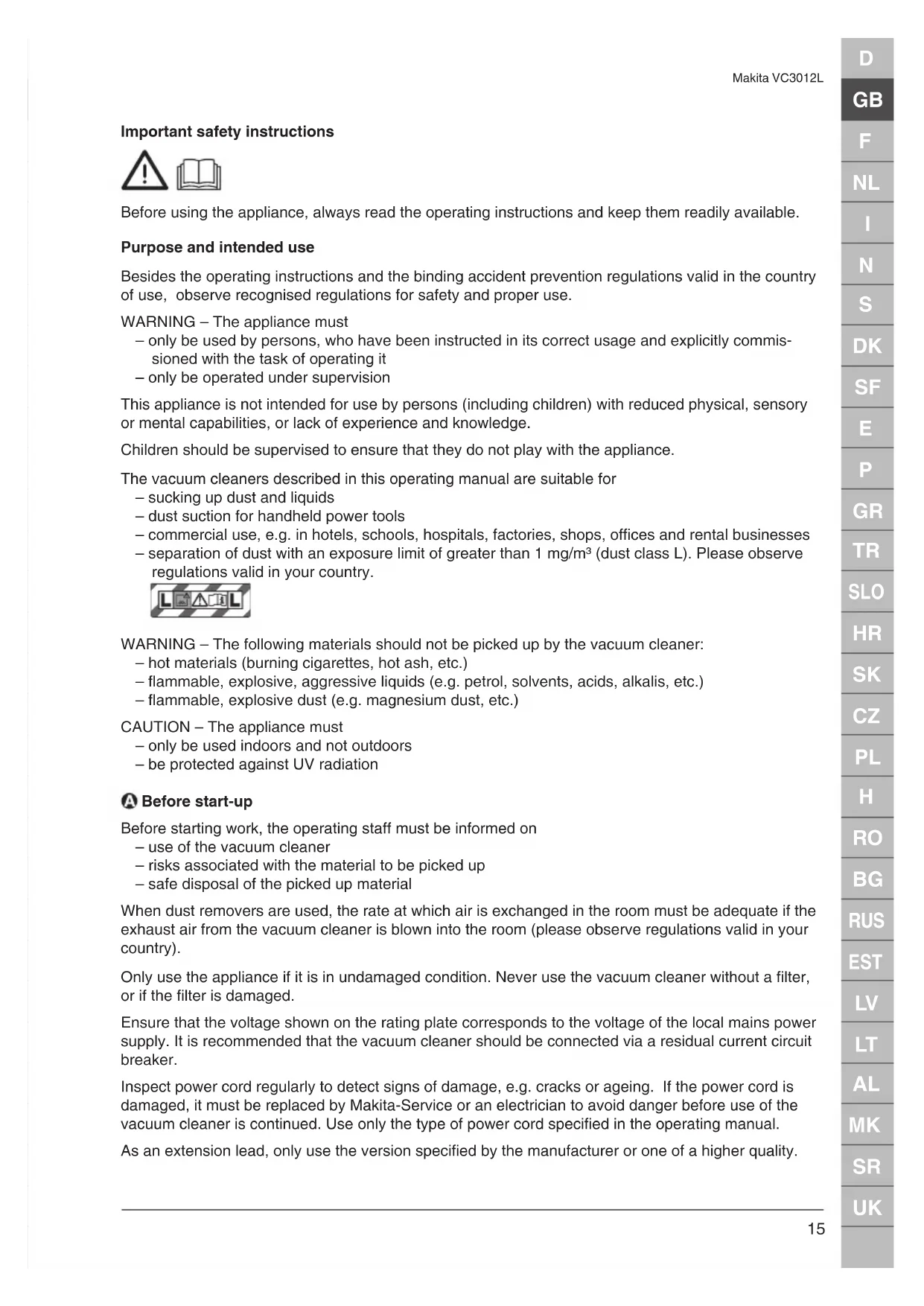 Makita VC3012L Important safety instructions Before using the appliance, always read the operating instructions and keep them readily available. Purpose and intended use Besides the operating instructions and the binding accident prevention regulations valid in the country of use, observe recognised regulations for safety and proper use. WARNING – The appliance must – only be used by persons, who have been instructed in its correct usage and explicitly commis- sioned with the task of operating it – only be operated under supervision This appliance is not intended for use by persons (including children) with reduced physical, sensory or mental capabilities, or lack of experience and knowledge. Children should be supervised to ensure that they do not play with the appliance. The vacuum cleaners described in this operating manual are suitable for – sucking up dust and liquids – dust suction for handheld power tools – commercial use, e.g. in hotels, schools, hospitals, factories, shops, offices and rental businesses – separation of dust with an exposure limit of greater than 1 mg/m³ (dust class L). Please observe regulations valid in your country. WARNING – The following materials should not be picked up by the vacuum cleaner: – hot materials (burning cigarettes, hot ash, etc.) – flammable, explosive, aggressive liquids (e.g. petrol, solvents, acids, alkalis, etc.) – flammable, explosive dust (e.g. magnesium dust, etc.) CAUTION – The appliance must – only be used indoors and not outdoors – be protected against UV radiation Before start-up Before starting work, the operating staff must be informed on – use of the vacuum cleaner – risks associated with the material to be picked up – safe disposal of the picked up material When dust removers are used, the rate at which air is exchanged in the room must be adequate if the exhaust air from the vacuum cleaner is blown into the room (please observe regulations valid in your country). Only use the appliance if it is in undamaged condition. Never use the vacuum cleaner without a filter, or if the filter is damaged. Ensure that the voltage shown on the rating plate corresponds to the voltage of the local mains power supply. It is recommended that the vacuum cleaner should be connected via a residual current circuit breaker. Inspect power cord regularly to detect signs of damage, e.g. cracks or ageing. If the power cord is damaged, it must be replaced by Makita-Service or an electrician to avoid danger before use of the vacuum cleaner is continued. Use only the type of power cord specified in the operating manual. As an extension lead, only use the version specified by the manufacturer or one of a higher quality.D