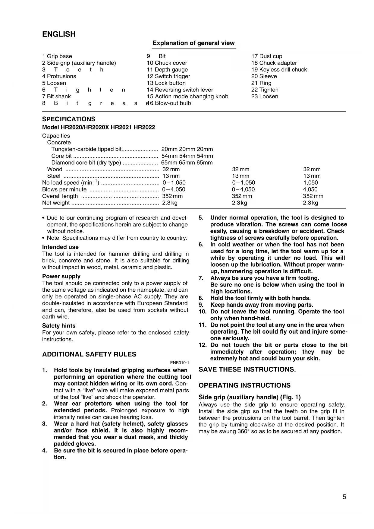 immediately after operation; they may be extremely hot and could burn your skin. SAVE THESE INSTRUCTIONS. OPERATING INSTRUCTIONS Side grip (auxiliary handle) (Fig. 1) Always use the side grip to ensure operating safety. Install the side girp so that the teeth on the grip fit in between the protrusions on the tool barrel. Then tighten the grip by turning clockwise at the desired position. It may be swung 360° so as to be secured at any position.6 Installing or removing the bit CAUTION: Always be sure that the tool is switched off and unplugged before installing or removing the bit. Clean the bit shank and apply bit grease before installing the bit. (Fig. 2) Insert the bit into the tool. Turn the bit and push it in until it engages. (Fig. 3) After installing, always make sure that the bit is securely held in place by trying to pull it out. To remove the bit, pull the chuck cover down all the way and pull the bit out. (Fig. 4) Depth gauge (Fig. 5) The depth gauge is convenient for drilling holes of uni- form depth. Loosen the side grip and insert the depth guage into the hole in the side grip. Adjust the depth gauge to the desired depth and tighten the side grip. NOTE: The depth gauge cannot be used at the position where the depth gauge strikes against the gear housing. Switch action (Fig. 6) CAUTION: Before plugging in the tool, always check to see that the switch trigger actuates properly and returns to the “OFF” position when released. For Model HR2020, HR2020X and HR2021 To start the tool, simply pull the switch trigger. Tool speed is increased by increasing pressure on the switch trigger. Release the switch trigger to stop. For continuous opera- tion, pull the switch trigger and then push in the lock but- ton. To stop the tool from the locked position, pull the switch trigger fully, then release it. For Model HR2022 To start the tool, simply pull the switch trigger. Release the switch trigger to stop. For continuous operation, pull the switch trigger and then push in the lock button. To stop the tool from the locked position, pull the switch trig- ger fully, then release it. Reversing switch action (Fig. 7) For Model HR2020 and HR2020X This tool has a reversing switch to change the direction of rotation. Move the reversing switch lever to the A side for clockwise rotation or the B side for counterclockwise rotation. CAUTION: