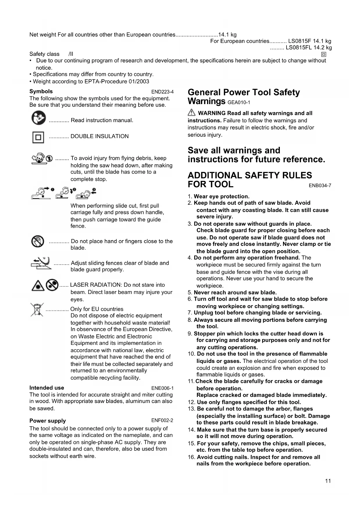- Weight according to EPTA-Procedure 01/2003 Symbols END223-4 The following show the symbols used for the equipment. Be sure that you understand their meaning before use. ............. Read instruction manual. ............. DOUBLE INSULATION ......... To avoid injury from flying debris, keep holding the saw head down, after making cuts, until the blade has come to a complete stop. When performing slide cut, first pull carriage fully and press down handle, then push carriage toward the guide fence. ............. Do not place hand or fingers close to the blade. .......... Adjust sliding fences clear of blade and blade guard properly. ...... LASER RADIATION: Do not stare into beam. Direct laser beam may injure your eyes. ............... Only for EU countries Do not dispose of electric equipment together with household waste material! In observance of the European Directive, on Waste Electric and Electronic Equipment and its implementation in accordance with national law, electric equipment that have reached the end of their life must be collected separately and returned to an environmentally compatible recycling facility. Intended use ENE006-1 The tool is intended for accurate straight and miter cutting in wood. With appropriate saw blades, aluminum can also be sawed. Power supply ENF002-2 The tool should be connected only to a power supply of the same voltage as indicated on the nameplate, and can only be operated on single-phase AC supply. They are double-insulated and can, therefore, also be used from sockets without earth wire. General Power Tool Safety Warnings GEA010-1 WARNING Read all safety warnings and all instructions. Failure to follow the warnings and instructions may result in electric shock, fire and/or serious injury. Save all warnings and instructions for future reference.