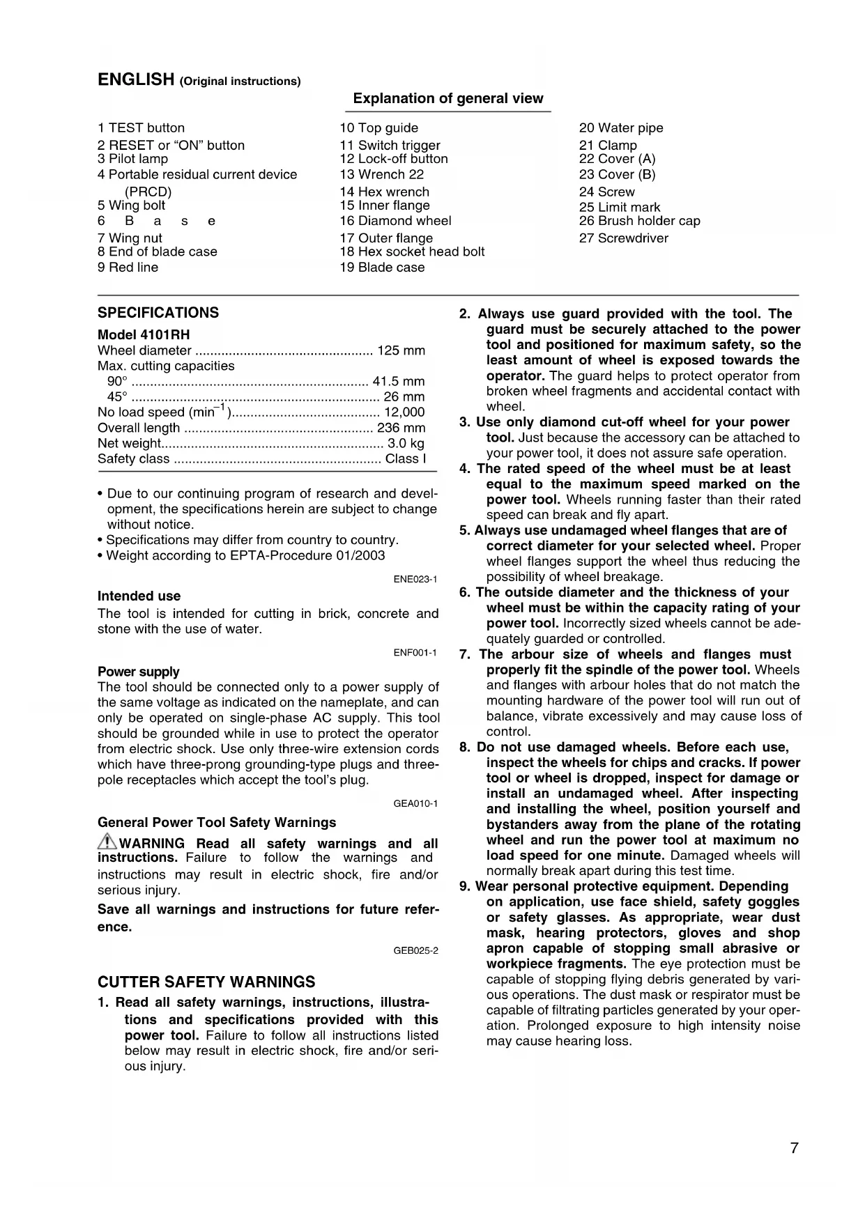 - Weight according to EPTA-Procedure 01/2003 ENE023-1 Intended use The tool is intended for cutting in brick, concrete and stone with the use of water. ENF001-1 Power supply The tool should be connected only to a power supply of the same voltage as indicated on the nameplate, and can only be operated on single-phase AC supply. This tool should be grounded while in use to protect the operator from electric shock. Use only three-wire extension cords which have three-prong grounding-type plugs and three- pole receptacles which accept the tool’s plug. GEA010-1 General Power Tool Safety Warnings WARNING Read all safety warnings and all instructions. Failure to follow the warnings and instructions may result in electric shock, fire and/or serious injury. Save all warnings and instructions for future refer- ence. GEB025-2