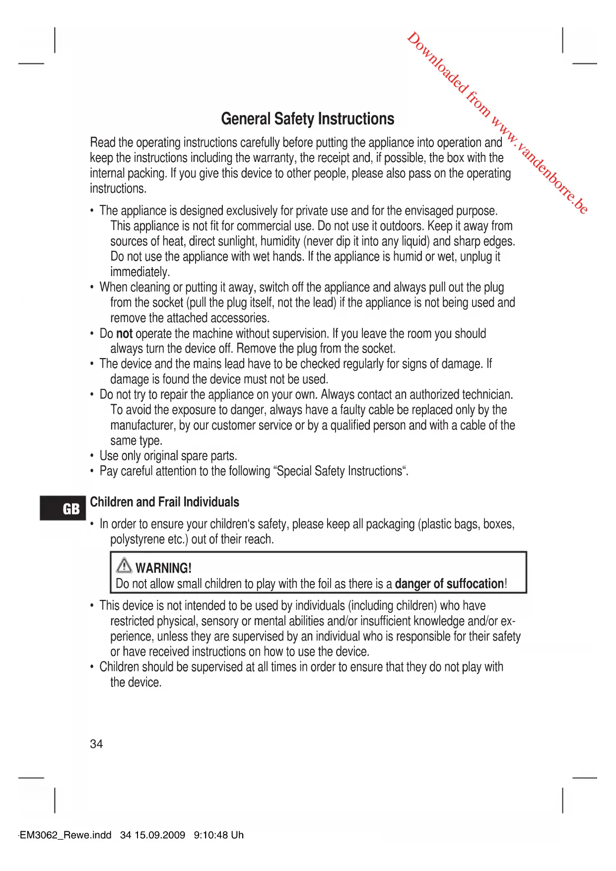 - Children should be supervised at all times in order to ensure that they do not play with the device. 05-EM3062_Rewe.indd 34 15.09.2009 9:10:48 Uhr Downloaded from www.vandenborre.beGB