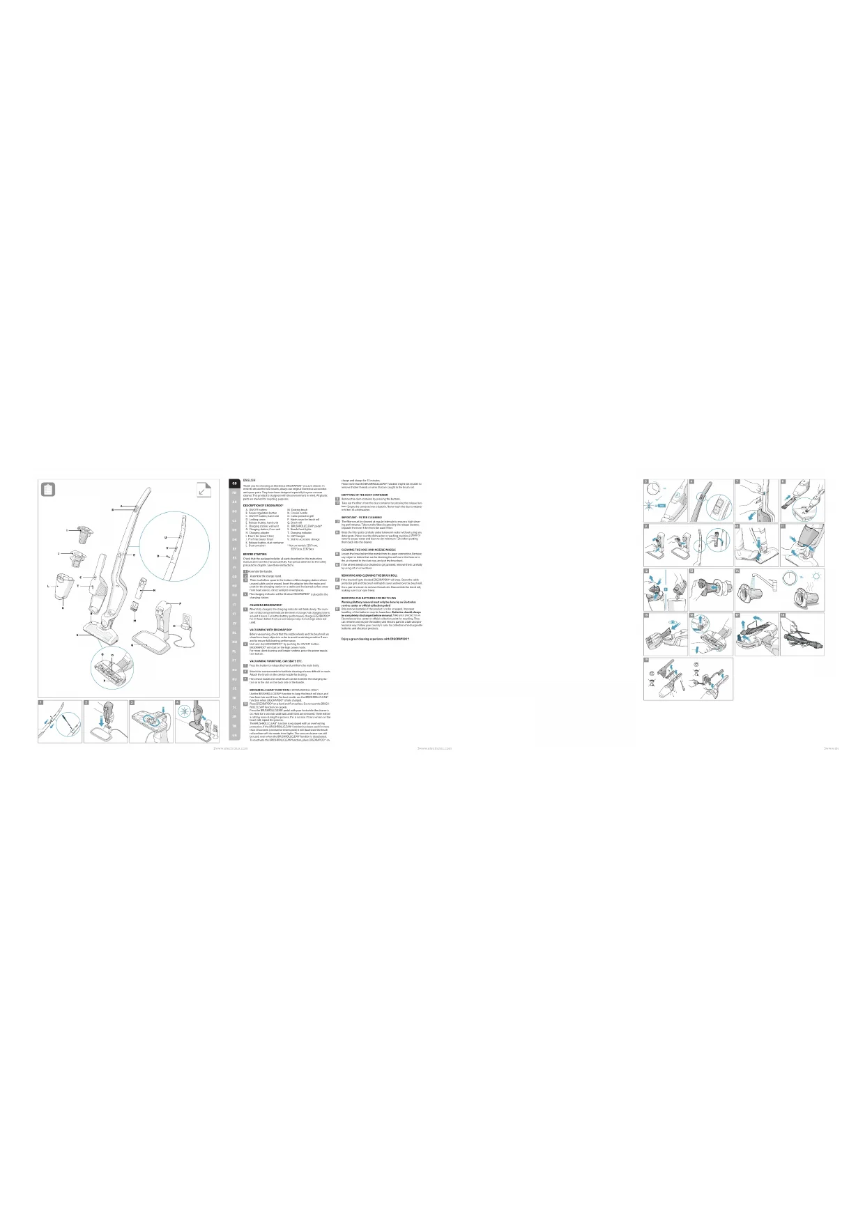 ENGLISH Thank you for choosing an Electrolux ERGORAPIDO® vacuum cleaner. In order to ensure the best results, always use original Electrolux accessories and spare parts. They have been designed especially for your vacuum cleaner. This product is designed with the environment in mind. All plastic parts are marked for recycling purposes.DESCRIPTION OF ERGORAPIDO®A. ON/OFF buttonB. Power regulation buttonC. ON/OFF button, hand unitD. Locking screwE. Release button, hand unitF. Charging station, wall unitG. Charging station, oor unitH. Charging adapterI. Fine lter (inner lter)J. Pre lter (outer lter)K. Release button, dust containerL. Dust containerM. Dusting brushN. Crevice nozzleO. Cable protector grillP. Hatch cover for brush rollQ. Brush rollR. BRUSHROLLCLEAN® pedal*S. Nozzle front lightsT. Charging indicatorU. Cli hangerV. Slot for accessory storage* Not on models EER71xxx, EER72xxx, EER73xxxBEFORE STARTINGCheck that the package includes all parts described in this instruction manual and read this manual carefully. Pay special attention to the safety precautions chapter. Save these instructions.1 Assemble the handle.2 Assemble the charge stand. 3 There is a hollow space in the bottom of the charging station where unused cable can be wound. Insert the adaptor into the mains and position the charging station on a stable and horizontal surface away from heat sources, direct sunlight or wet places. 4 The charging indicator will be lit when ERGORAPIDO is placed in the charging station.CHARGING ERGORAPIDO® 5 When fully charged, the charging indicator will blink slowly. The num- bers of LED lamps will indicate the level of charge. Full charging time is around 4hours. For better battery performance, charge ERGORAPIDO® for 24hours before rst use and always keep it on charge when not used.VACUUMING WITH ERGORAPIDO® Before vacuuming, check that the nozzle wheels and the brush roll are clean from sharp objects in order to avoid scratching sensitive oors and to ensure full cleaning performance.6 Start and stop ERGORAPIDO by pushing the ON/OFF button. ERGORAPIDO will start on the high power mode.For more silent cleaning and longer runtime, press the power regula-tion button.VACUUMING FURNITURE, CAR SEATS ETC. 7 Press the button to release the hand unit from the main body. 8 Attach the crevice nozzle to facilitate cleaning of areas di cult to reach. Attach the brush on the crevice nozzle for dusting. 9 The crevice nozzle and small brush can be stored in the charging sta- tion or in the slot on the back side of the handle.BRUSHROLLCLEAN® FUNCTION (CERTAIN MODELS ONLY) Use the BRUSHROLLCLEAN® function to keep the brush roll clean and free from hair and bres. For best results use the BRUSHROLLCLEAN® function when ERGORAPIDO® is fully charged.10 Place ERGORAPIDO on a hard and at surface. Do not use the BRUSH-ROLLCLEAN function on carpets.Press the BRUSHROLLCLEAN pedal with your foot while the cleaner is on. Hold for 5 seconds until hairs and bres are removed. There will be a cutting noise during this process, this is normal. If hairs remain on the brush roll, repeat the process.The BRUSHROLLCLEAN function is equipped with an overheating protection. If the BRUSHROLLCLEAN function has been used for more than 30 seconds (constant or interrupted) it will deactivate the brush roll and turn o the nozzle front lights. The vacuum cleaner can still be used, even when the BRUSHROLLCLEAN function is deactivated. Toreactivate the BRUSHROLLCLEAN function, place ERGORAPIDO