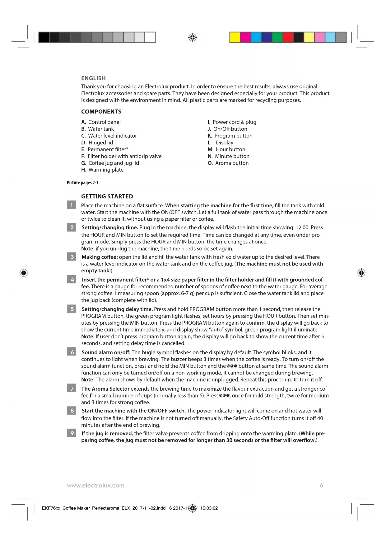 When contacting Service, ensure that you have the following data available: - Model Number - PNC number - Serial number The information can be found on the rating plate. EKF76xx_Coffee Maker_Perfectaroma_ELX_2017-11-02.indd 4 2017-11-03 15:03:025www.electrolux.com EKF76xx_Coffee Maker_Perfectaroma_ELX_2017-11-02.indd 5 2017-11-03 15:03:026 www.electrolux.com ENGLISH Thank you for choosing an Electrolux product. In order to ensure the best results, always use original Electrolux accessories and spare parts. They have been designed especially for your product. This product is designed with the environment in mind. All plastic parts are marked for recycling purposes. COMPONENTS A. Control panel B. Water tank C. Water level indicator D. Hinged lid E. Permanent lter* F. Filter holder with antidrip valve G. Coee jug and jug lid H. Warming plate