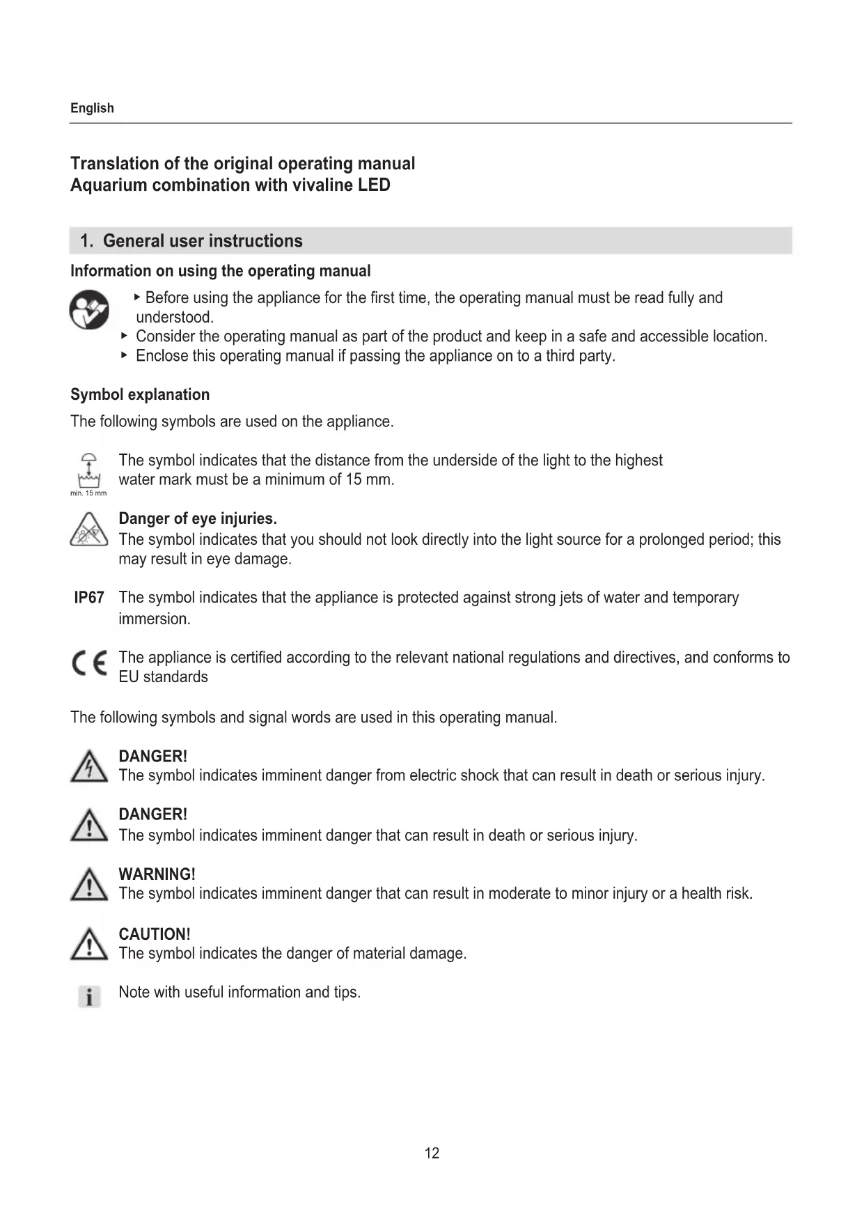 Information on using the operating manual ▶ Before using the appliance for the rst time, the operating manual must be read fully and understood. ▶ Consider the operating manual as part of the product and keep in a safe and accessible location. ▶ Enclose this operating manual if passing the appliance on to a third party. Symbol explanation The following symbols are used on the appliance. The symbol indicates that the distance from the underside of the light to the highest water mark must be a minimum of 15 mm. Danger of eye injuries. The symbol indicates that you should not look directly into the light source for a prolonged period; this may result in eye damage. The symbol indicates that the appliance is protected against strong jets of water and temporary immersion. The appliance is certied according to the relevant national regulations and directives, and conforms to EU standards The following symbols and signal words are used in this operating manual. DANGER! The symbol indicates imminent danger from electric shock that can result in death or serious injury. DANGER! The symbol indicates imminent danger that can result in death or serious injury. WARNING! The symbol indicates imminent danger that can result in moderate to minor injury or a health risk. CAUTION! The symbol indicates the danger of material damage. Note with useful information and tips. min. 15 mm IP6713 English Typographical conventions Reference to a gure; in this case, reference to gure A You are prompted for an action.