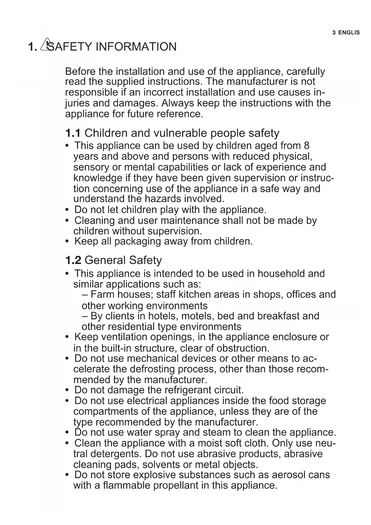 - Do not store ammable gas and liquid in the appliance.