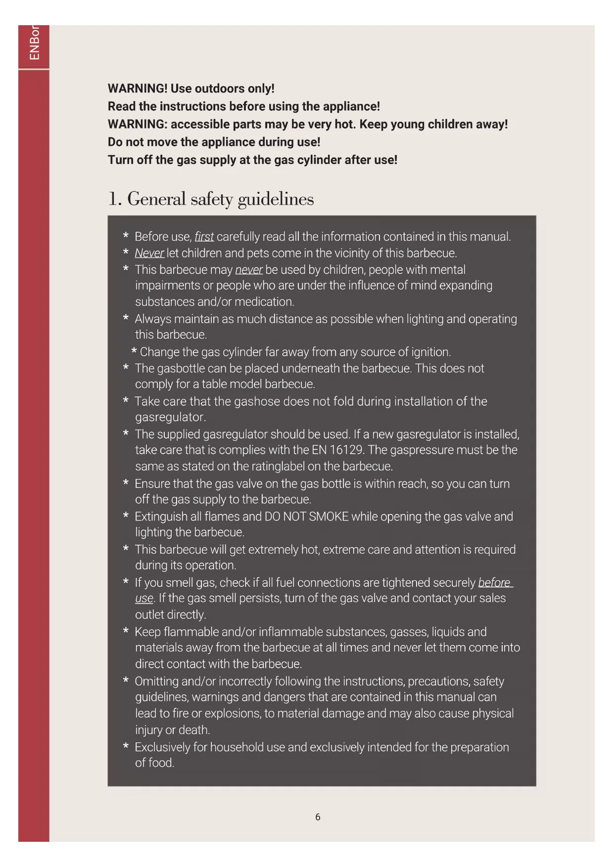 - The supplied gasregulator should be used. If a new gasregulator is installed, take care that is complies with the EN 16129. The gaspressure must be the same as stated on the ratinglabel on the barbecue.