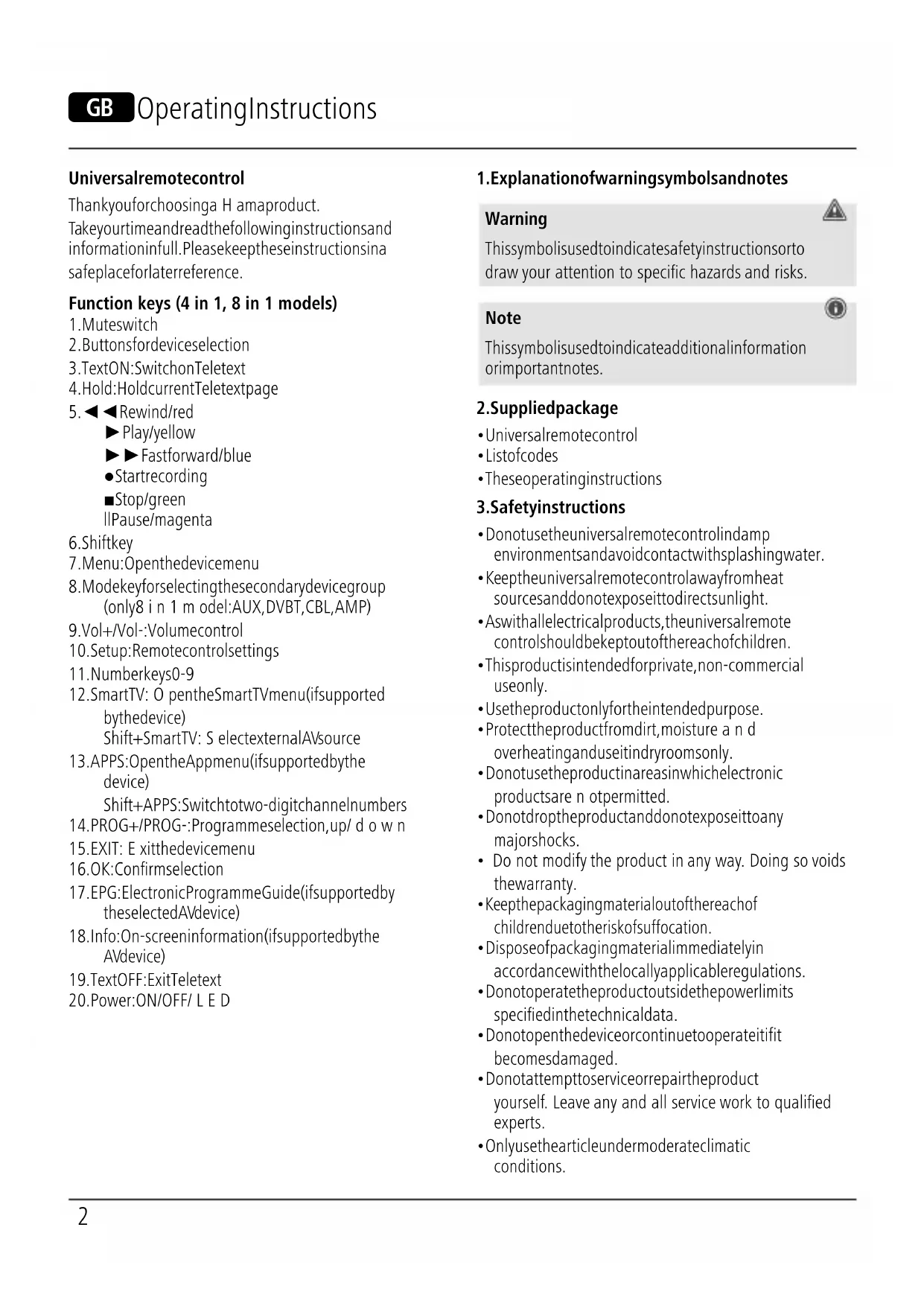G Operating Instructions Universal remote control Thank you for choosing aHama product. Take your time and read the following instructions and information in full. Please keep these instructions in a safe place for later reference. Function keys (4 in 1, 8in1models)