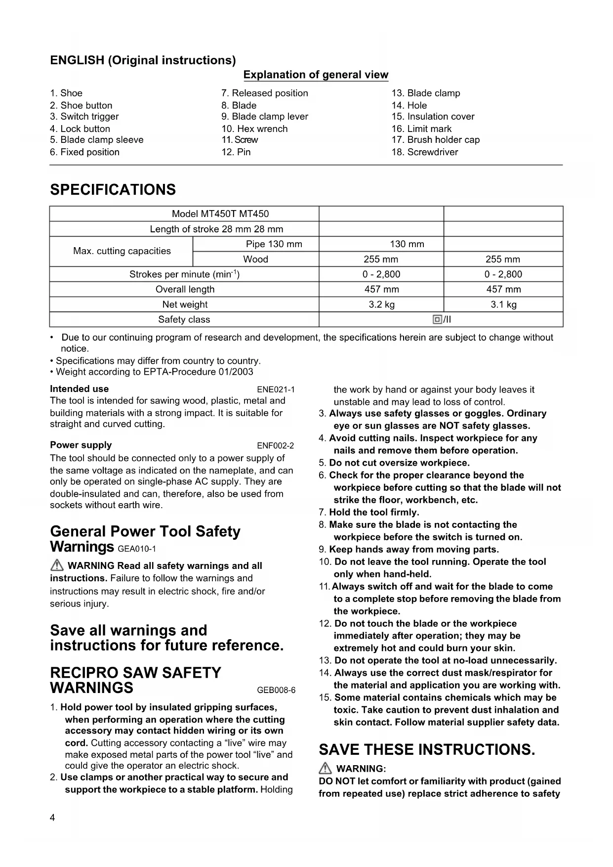 - Be sure to identify safety measures to protect the operator that are based on an estimation of exposure in the actual conditions of use (taking account of all parts of the operating cycle such as the times when the tool is switched off and when it is running idle in addition to the trigger time). For European countries only ENH101-17 EC Declaration of Conformity Makita declares that the following Machine(s): Designation of Machine: Recipro Saw Model No./Type: MT450T, MT450 Conforms to the following European Directives: 2006/42/EC They are manufactured in accordance with the following Standard or standardized documents: EN60745 The Technical file in accordance with 2006/42/EC is available from: Makita, Jan-Baptist Vinkstraat 2, 3070, Belgium
