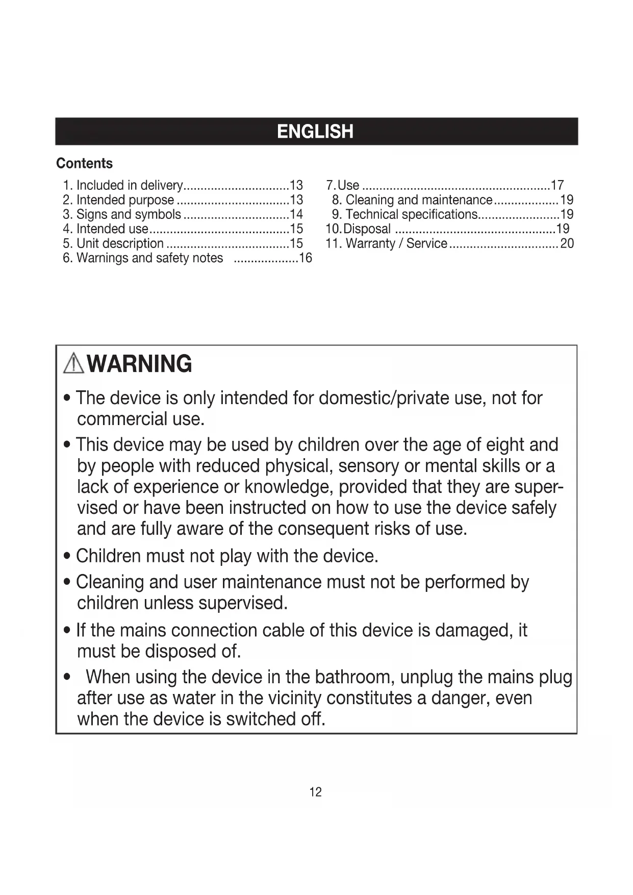 - Never use the device near baths, wash basins, showers or other objects containing water or other liquids – risk of electric shock!