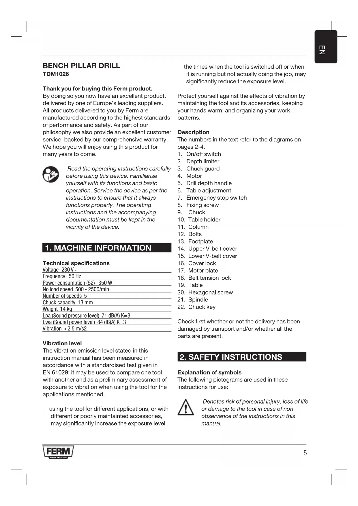 TDM1026 Thank you for buying this Ferm product. By doing so you now have an excellent product, delivered by one of Europe’s leading suppliers. All products delivered to you by Ferm are manufactured according to the highest standards of performance and safety. As part of our philosophy we also provide an excellent customer service, backed by our comprehensive warranty. We hope you will enjoy using this product for many years to come. Read the operating instructions carefully before using this device. Familiarise yourself with its functions and basic operation. Service the device as per the instructions to ensure that it always functions properly. The operating instructions and the accompanying documentation must be kept in the vicinity of the device.