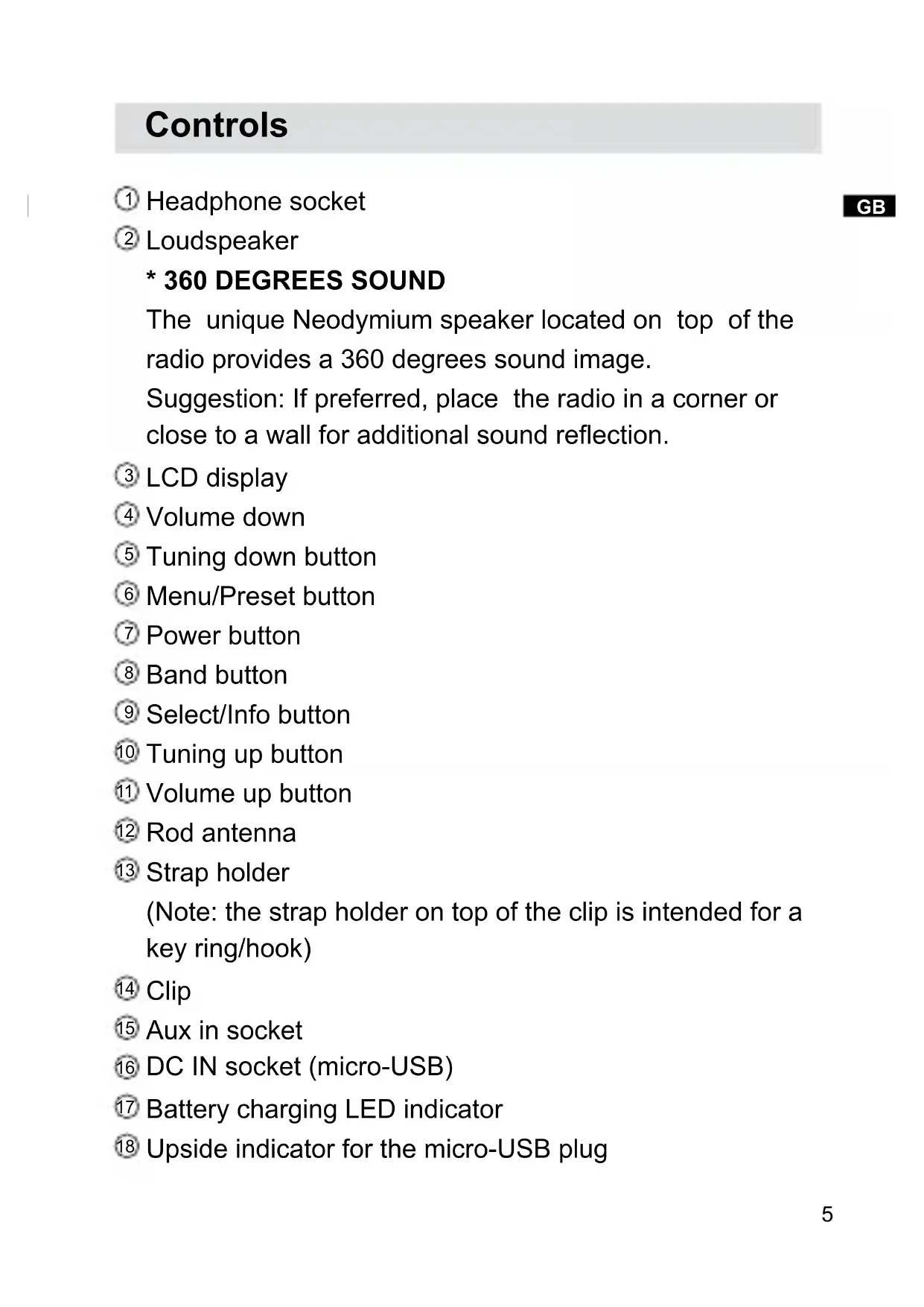 - 360 DEGREES SOUND The unique Neodymium speaker located on top of the radio provides a 360 degrees sound image. Suggestion: If preferred, place the radio in a corner or close to a wall for additional sound reection. LCD display Volume down Tuning down button Menu/Preset button Power button Band button Select/Info button Tuning up button Volume up button Rod antenna Strap holder (Note: the strap holder on top of the clip is intended for a key ring/hook) Clip Aux in socket DC IN socket (micro-USB) Battery charging LED indicator Upside indicator for the micro-USB plug