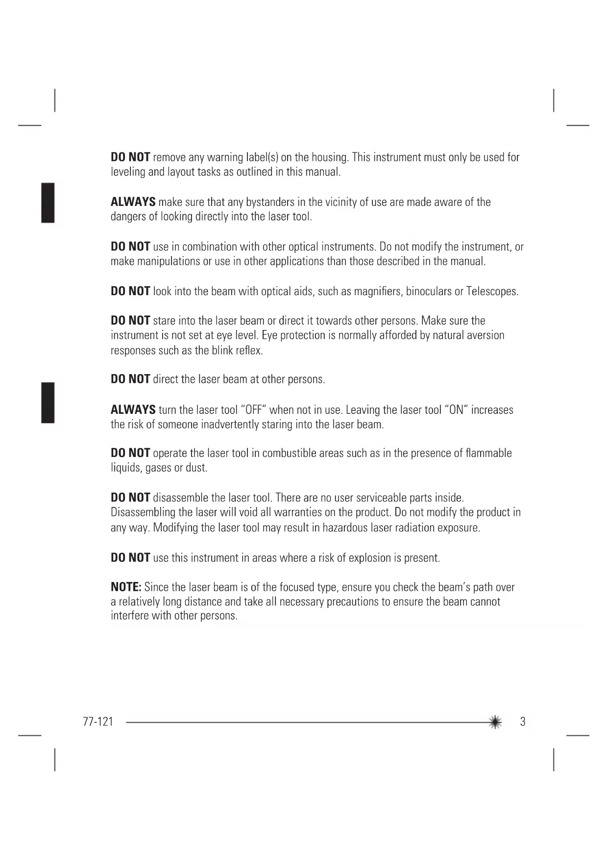 LT LT LT LT TR TR TR HR HR HR HR3 77-121 DO NOT remove any warning label(s) on the housing. This instrument must only be used for leveling and layout tasks as outlined in this manual. ALWAYS make sure that any bystanders in the vicinity of use are made aware of the dangers of looking directly into the laser tool. DO NOT use in combination with other optical instruments. Do not modify the instrument, or make manipulations or use in other applications than those described in the manual. DO NOT look into the beam with optical aids, such as magnifiers, binoculars or Telescopes. DO NOT stare into the laser beam or direct it towards other persons. Make sure the instrument is not set at eye level. Eye protection is normally afforded by natural aversion responses such as the blink reflex. DO NOT direct the laser beam at other persons. ALWAYS turn the laser tool “OFF” when not in use. Leaving the laser tool “ON” increases the risk of someone inadvertently staring into the laser beam. DO NOT operate the laser tool in combustible areas such as in the presence of flammable liquids, gases or dust. DO NOT disassemble the laser tool. There are no user serviceable parts inside. Disassembling the laser will void all warranties on the product. Do not modify the product in any way. Modifying the laser tool may result in hazardous laser radiation exposure. DO NOT use this instrument in areas where a risk of explosion is present. NOTE: Since the laser beam is of the focused type, ensure you check the beam’s path over a relatively long distance and take all necessary precautions to ensure the beam cannot interfere with other persons.4 77-121