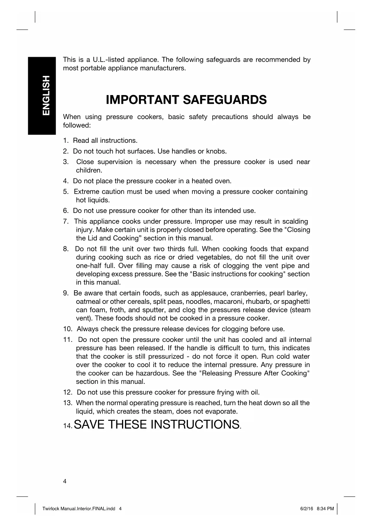 SAVE THESE INSTRUCTIONS. This is a U.L.-listed appliance. The following safeguards are recommended by most portable appliance manufacturers. IMPORTANT SAFEGUARDS Twirlock Manual.Interior.FINAL.indd 4Twirlock Manual.Interior.FINAL.indd 4 6/2/16 8:34 PM6/2/16 8:34 PM5 ENGLISH Manufacturer’s Recommendations To fully enjoy your new Fagor Pressure Cooker, please read carefully these recommendations before you start using your pressure cooker, and follow them accordingly: