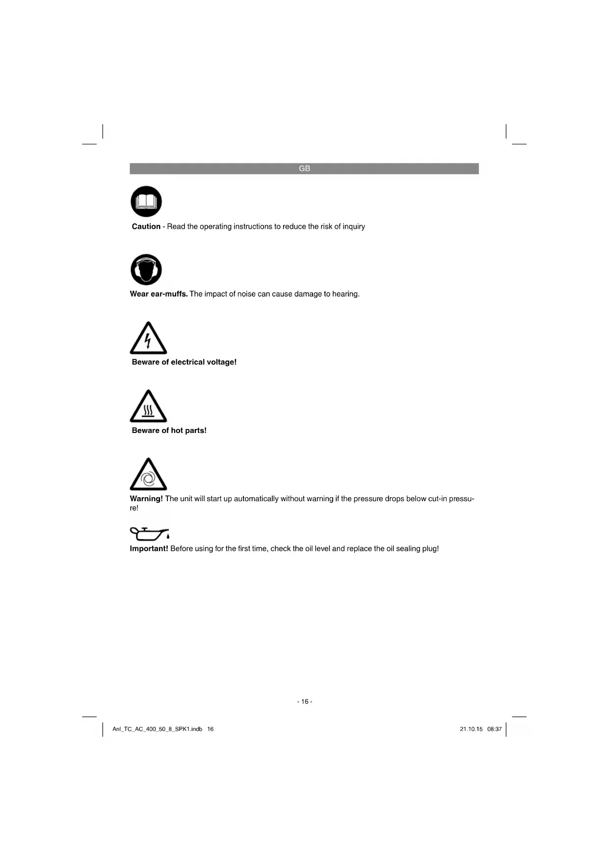 Beware of electrical voltage! Beware of hot parts! Warning! The unit will start up automatically without warning if the pressure drops below cut-in pressu- re! Important! Before using for the fi rst time, check the oil level and replace the oil sealing plug! Wear ear-muff s. The impact of noise can cause damage to hearing. Caution - Read the operating instructions to reduce the risk of inquiry Anl_TC_AC_400_50_8_SPK1.indb 16Anl_TC_AC_400_50_8_SPK1.indb 16 21.10.15 08:3721.10.15 08:37GB
