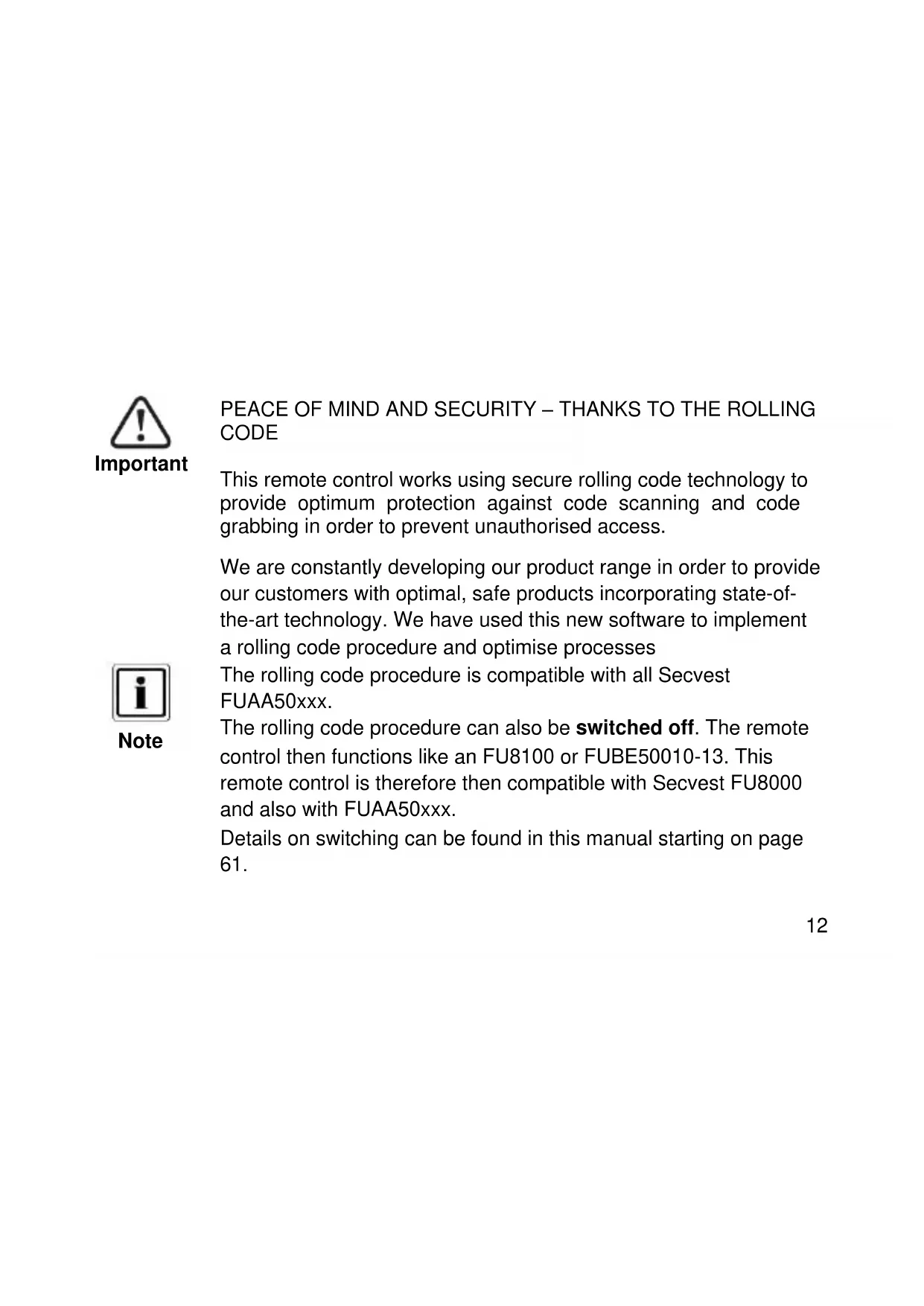 The rolling code procedure can also be switched off. The remote control then functions like an FU8100 or FUBE50010-13. This remote control is therefore then compatible with Secvest FU8000 and also with FUAA50xxx.