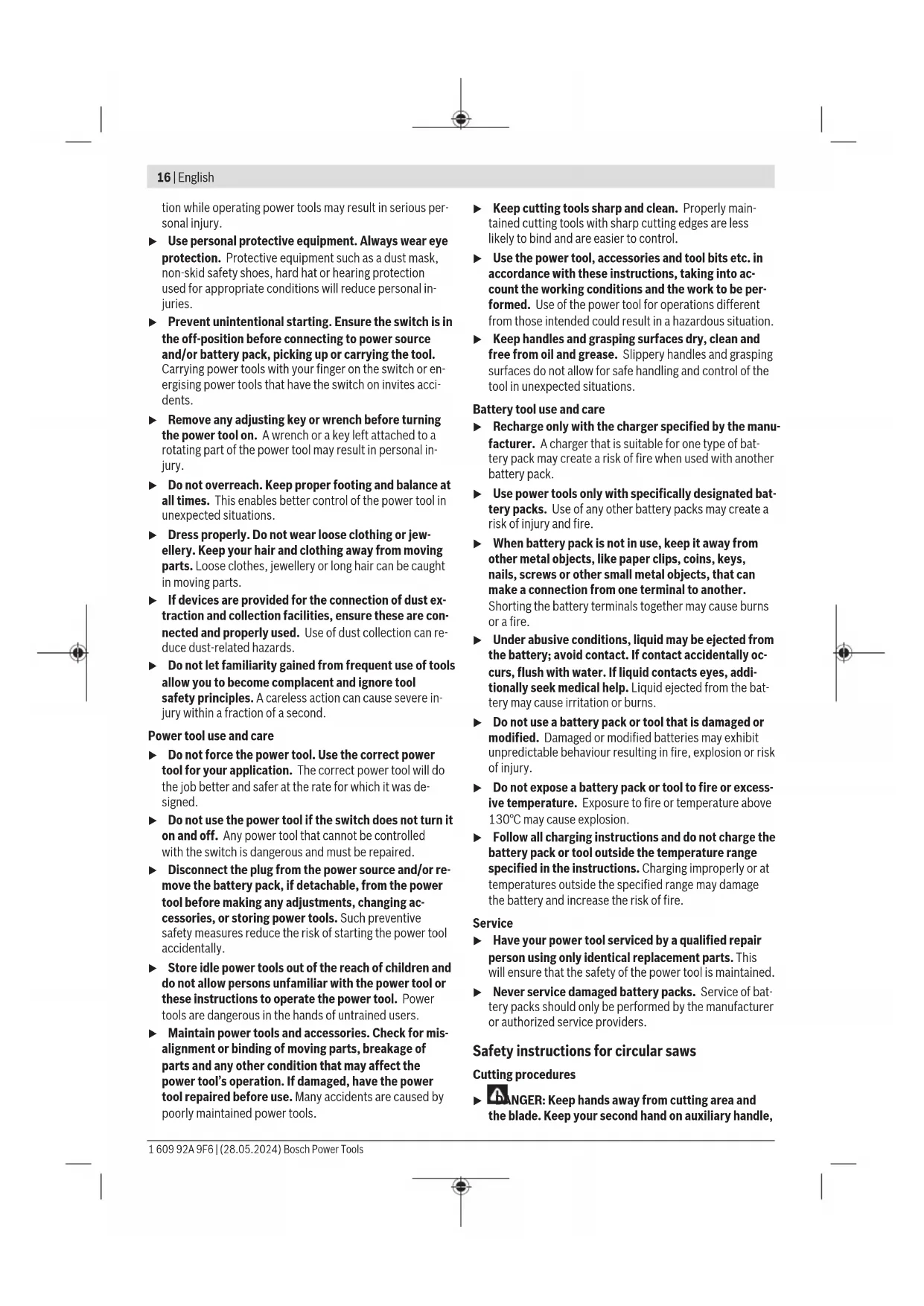 äußeren Abmessung größer als 25cm sind, im Einzel- handelsgeschäft oder in unmittelbarer Nähe hierzu un- entgeltlich zurückzunehmen; die Rücknahme darf nicht an den Kauf eines Elektro- oder Elektronikgerätes ge- knüpft werden und ist auf drei Altgeräte pro Geräteart beschränkt. Der Vertreiber hat beim Abschluss des Kaufvertrags für das neue Elektro- oder Elektronikgerät den Endnutzer über die Möglichkeit zur unentgeltlichen Rückgabe bzw. Abholung des Altgeräts zu informieren und den Endnutzer nach seiner Absicht zu befragen, ob bei der Auslieferung des neuen Ge- räts ein Altgerät zurückgegeben wird. Dies gilt auch bei Vertrieb unter Verwendung von Fernkom- munikationsmitteln, wenn die Lager- und Versandflächen für Elektro- und Elektronikgeräte mindestens 400m² betragen oder die gesamten Lager- und Versandflächen mindestens 800m² betragen, wobei die unentgeltliche Abholung auf Elektro- und Elektronikgeräte der Kategorien 1 (Wärmeüber- träger), 2 (Bildschirmgeräte) und 4 (Großgeräte mit mindes- tens einer äußeren Abmessung über 50cm) beschränkt ist. Für alle übrigen Elektro- und Elektronikgeräte muss der Ver- treiber geeignete Rückgabemöglichkeiten in zumutbarer Ent- fernung zum jeweiligen Endnutzer gewährleisten; das gilt auch für Altgeräte, die in keiner äußeren Abmessung größer als 25cm sind, die der Endnutzer zurückgeben will, ohne ein neues Gerät zu kaufen. Akkus/Batterien: Li-Ion: Bitte beachten Sie die Hinweise im Abschnitt Transport (sie- he „Transport“, Seite14). English Safety Instructions General Power Tool Safety Warnings WARNING Read all safety warnings, instruc- tions, illustrations and specifica- tions provided with this power tool. Failure to follow all in- structions listed below may result in electric shock, fire and/ or serious injury. Save all warnings and instructions for future reference. The term "power tool" in the warnings refers to your mains- operated (corded) power tool or battery-operated (cord- less) power tool. Work area safety u Keep work area clean and well lit. Cluttered or dark areas invite accidents. u Do not operate power tools in explosive atmospheres, such as in the presence of flammable liquids, gases or dust. Power tools create sparks which may ignite the dust or fumes. u Keep children and bystanders away while operating a power tool. Distractions can cause you to lose control. Electrical safety u Power tool plugs must match the outlet. Never modify the plug in any way. Do not use any adapter plugs with earthed (grounded) power tools. Unmodified plugs and matching outlets will reduce risk of electric shock. u Avoid body contact with earthed or grounded sur- faces, such as pipes, radiators, ranges and refrigerat- ors. There is an increased risk of electric shock if your body is earthed or grounded. u Do not expose power tools to rain or wet conditions. Water entering a power tool will increase the risk of elec- tric shock. u Do not abuse the cord. Never use the cord for carry- ing, pulling or unplugging the power tool. Keep cord away from heat, oil, sharp edges or moving parts. Damaged or entangled cords increase the risk of electric shock. u When operating a power tool outdoors, use an exten- sion cord suitable for outdoor use. Use of a cord suit- able for outdoor use reduces the risk of electric shock. u If operating a power tool in a damp location is un- avoidable, use a residual current device (RCD) protec- ted supply. Use of an RCD reduces the risk of electric shock. Personal safety u Stay alert, watch what you are doing and use common sense when operating a power tool. Do not use a power tool while you are tired or under the influence of drugs, alcohol or medication. A moment of inatten- Bosch Power Tools 1 609 92A 9F6 | (28.05.2024)16 | English tion while operating power tools may result in serious per- sonal injury. u Use personal protective equipment. Always wear eye protection. Protective equipment such as a dust mask, non-skid safety shoes, hard hat or hearing protection used for appropriate conditions will reduce personal in- juries. u Prevent unintentional starting. Ensure the switch is in the off-position before connecting to power source and/or battery pack, picking up or carrying the tool. Carrying power tools with your finger on the switch or en- ergising power tools that have the switch on invites acci- dents. u Remove any adjusting key or wrench before turning the power tool on. A wrench or a key left attached to a rotating part of the power tool may result in personal in- jury. u Do not overreach. Keep proper footing and balance at all times. This enables better control of the power tool in unexpected situations. u Dress properly. Do not wear loose clothing or jew- ellery. Keep your hair and clothing away from moving parts. Loose clothes, jewellery or long hair can be caught in moving parts. u If devices are provided for the connection of dust ex- traction and collection facilities, ensure these are con- nected and properly used. Use of dust collection can re- duce dust-related hazards. u Do not let familiarity gained from frequent use of tools allow you to become complacent and ignore tool safety principles. A careless action can cause severe in- jury within a fraction of a second. Power tool use and care u Do not force the power tool. Use the correct power tool for your application. The correct power tool will do the job better and safer at the rate for which it was de- signed. u Do not use the power tool if the switch does not turn it on and off. Any power tool that cannot be controlled with the switch is dangerous and must be repaired. u Disconnect the plug from the power source and/or re- move the battery pack, if detachable, from the power tool before making any adjustments, changing ac- cessories, or storing power tools. Such preventive safety measures reduce the risk of starting the power tool accidentally. u Store idle power tools out of the reach of children and do