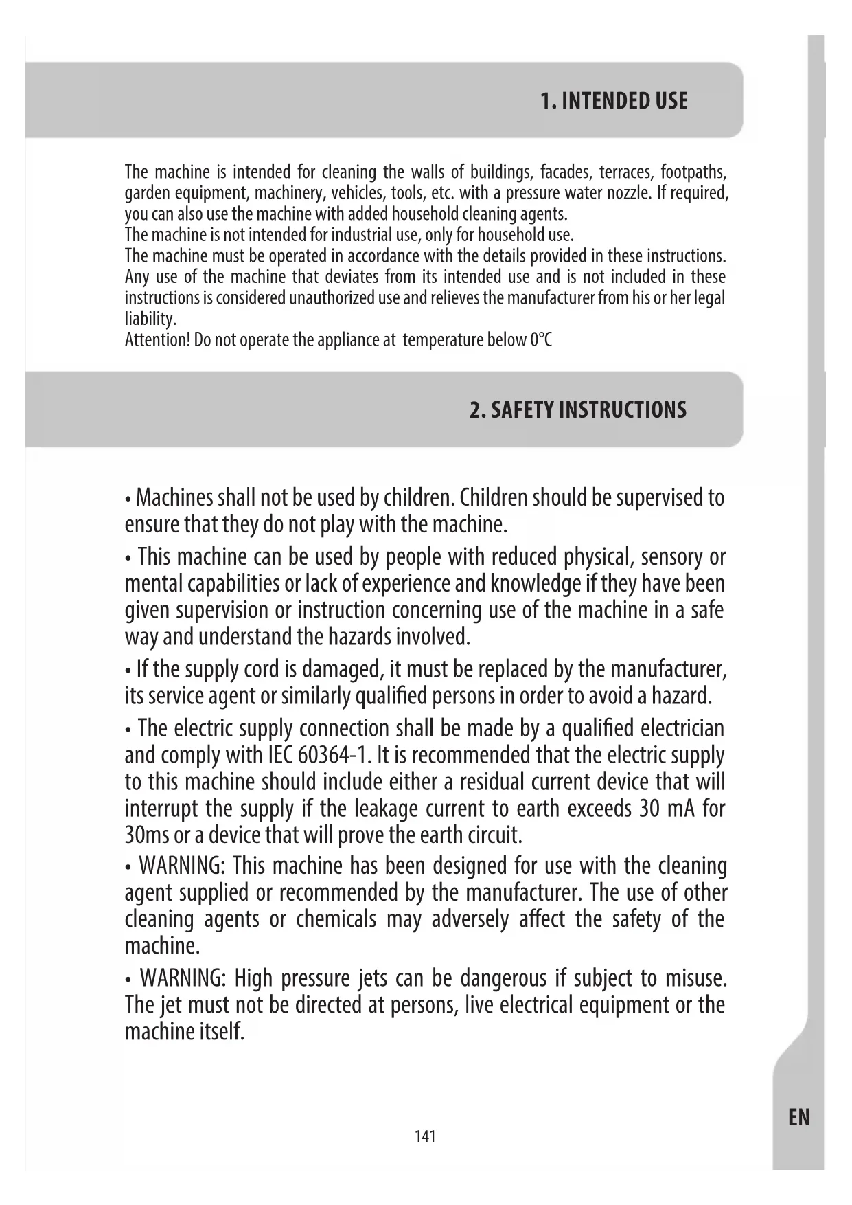 The machine is intended for cleaning the walls of buildings, facades, terraces, footpaths, garden equipment, machinery, vehicles, tools, etc. with a pressure water nozzle. If required, you can also use the machine with added household cleaning agents. The machine is not intended for industrial use, only for household use. The machine must be operated in accordance with the details provided in these instructions. Any use of the machine that deviates from its intended use and is not included in these instructions is considered unauthorized use and relieves the manufacturer from his or her legal liability. Attention! Do not operate the appliance at temperature below 0°C