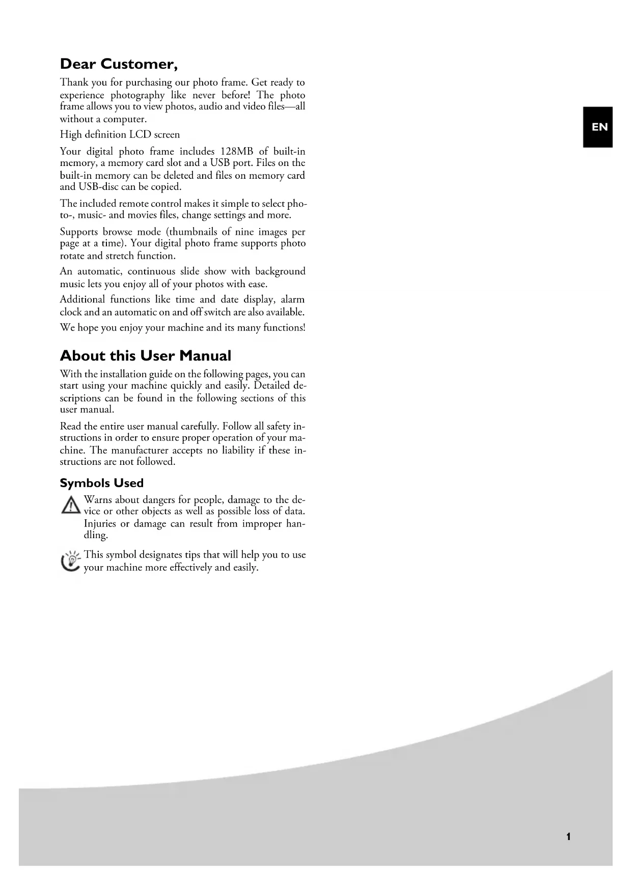 Thank you for purchasing our photo frame. Get ready to experience photography like never before! The photo frame allows you to view photos, audio and video files—all without a computer.