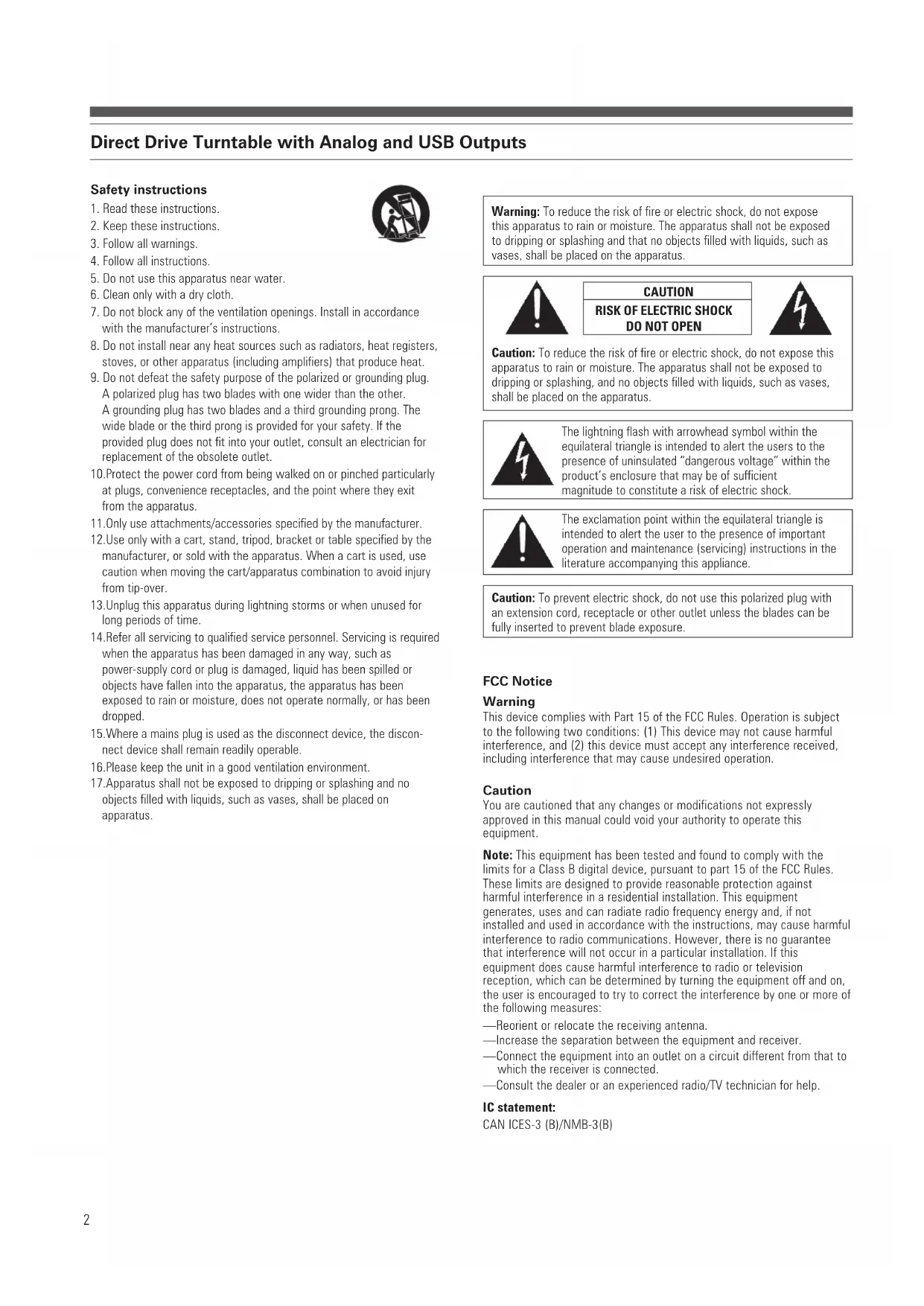 Analog Audio Connections Digital Audio USB Connection to Computers with USB Input Preparing to Play Playing a Record Suspending or Ending Play Connect the audio output cable to the appropriate input sockets on your amplifier, receiver, powered speakers, soundcard or other device based on the setting of the pre-amplifier selector switch. Warning This device complies with Part 15 of theFCC Rules. Operation is subject to thefollowing two conditions: (1) This device may not cause harmful interference, and (2) this device must accept any interference received, including interference that may cause undesired operation. Caution You are cautioned that any changes or modifications not expressly approved in this manual could void your authority to operate this equipment. Note: This equipment has been tested and found to comply with the limits for a Class B digital device, pursuant to part 15 of the FCC Rules. These limits are designed to provide reasonable protection against harmful interference in a residential installation. This equipment generates, uses and can radiate radio frequency energy and, if not installed and used in accordance with the instructions, may cause harmful interference to radio communications. However, there is no guarantee that interference will not occur in a particular installation. If this equipment does cause harmful interference to radio or television reception, which can be determined by turning the equipment off and on, the user is encouraged to try to correct the interference by one or more of the following measures: —Reorient or relocate the receiving antenna. —Increase the separation between the equipment and receiver. —Connect the equipment into an outlet on a circuit different from that to which the receiver is connected. —Consult the dealer or an experienced radio/TV technician for help. IC statement: CAN ICES-3 (B)/NMB-3(B)