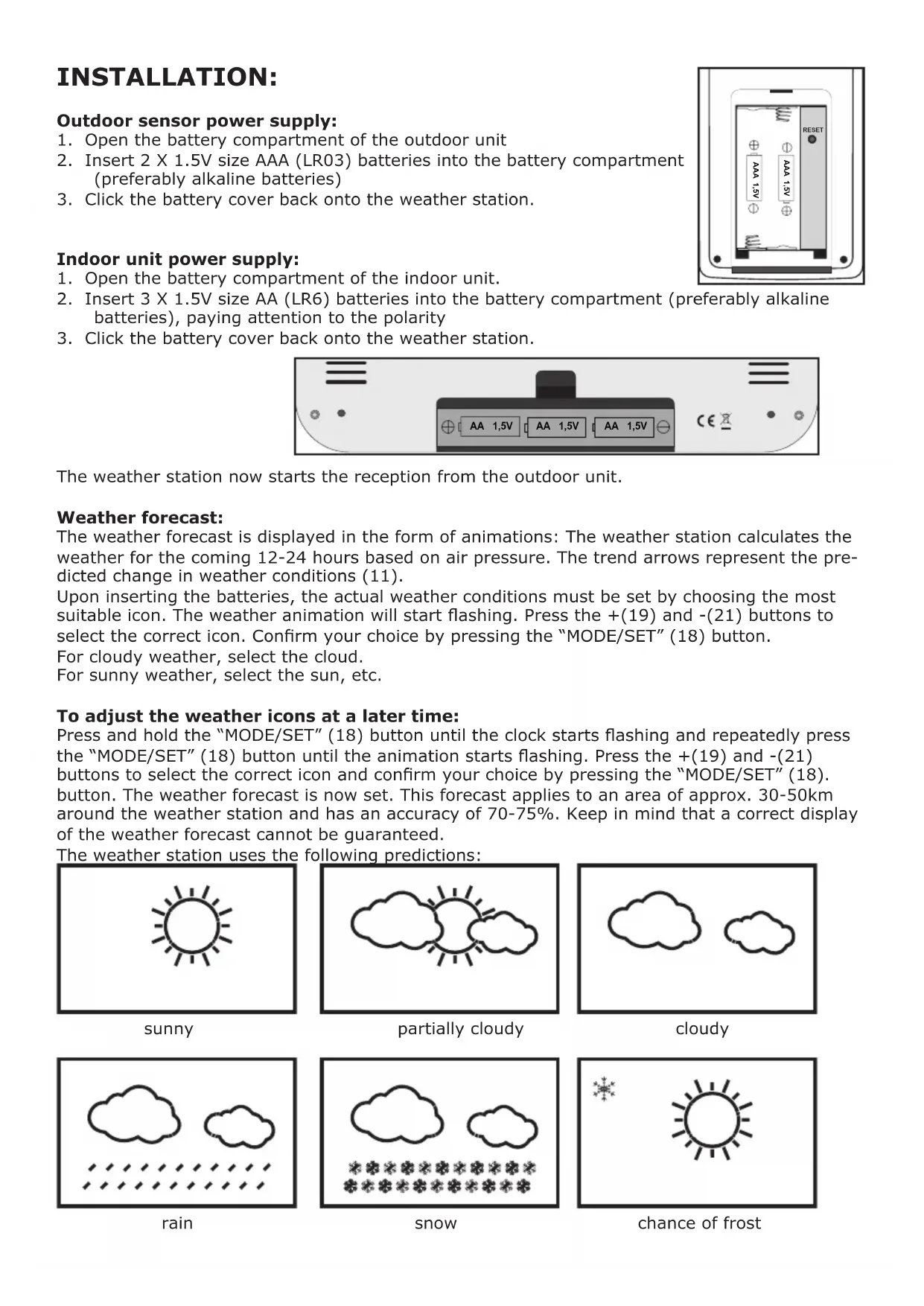 Upon inserting the batteries, the actual weather conditions must be set by choosing the most suitable icon. The weather animation will start flashing. Press the +(19) and (-21) buttons to select the correct icon. Confirm your choice by pressing the "MODE/SET" (18) button.