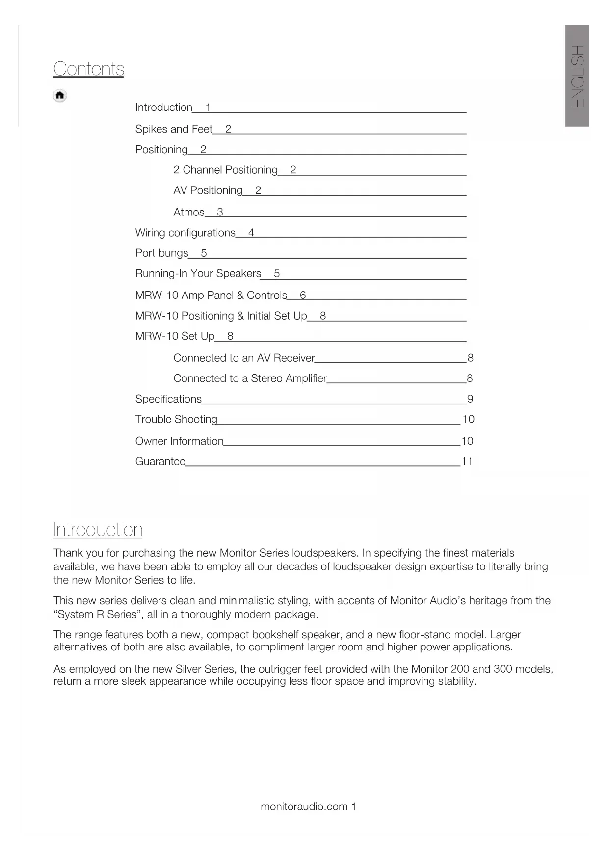 POLSKI 132 БЕЛАРУСКАЯ 144 ҚАЗАҚША 156Contents Introduction Thank you for purchasing the new Monitor Series loudspeakers. In specifying the finest materials available, we have been able to employ all our decades of loudspeaker design expertise to literally bring the new Monitor Series to life. This new series delivers clean and minimalistic styling, with accents of Monitor Audio’s heritage from the “System R Series”, all in a thoroughly modern package. The range features both a new, compact bookshelf speaker, and a new floor-stand model. Larger alternatives of both are also available, to compliment larger room and higher power applications. As employed on the new Silver Series, the outrigger feet provided with the Monitor 200 and 300 models, return a more sleek appearance while occupying less floor space and improving stability. monitoraudio.com 1 Introduction 1 Spikes and Feet 2 Positioning 2 2 Channel Positioning 2 AV Positioning 2 Atmos 3 Wiring configurations 4 Port bungs 5 Running-In Your Speakers 5 MRW-10 Amp Panel & Controls 6 MRW-10 Positioning & Initial Set Up 8 MRW-10 Set Up 8 Connected to an AV Receiver 8 Connected to a Stereo Amplifier 8 Specifications 9 Trouble Shooting 10 Owner Information 10 Guarantee 11 ENGLISHMonitor Series2 Spikes and Feet (Monitor 200 & 300 only) If the speaker is being installed on a carpeted floor, screw the spike into the foot and ‘out-rigger’ assembly. Fix them to the speaker base using the supplied bolts (A & B). You can check that the speaker is level on all sides by using the spirit level. If it’s slightly off-level, unscrew the foot at the lowest point and check again. Continue this process until the cabinet is fully level. Use the locking nuts on each foot to fix the feet in place and to stop any unwanted vibrations. Please ensure there are no hidden wires under the carpet that could be damaged by the spikes. If spikes aren’t to be used, please position the included self adhesive rubber feet on the bottom of the outrigger. Positioning 2 Channel Positioning When arranging a 2 channel system, the listening position and the loudspeakers should form an equilateral triangle. The speakers should be positioned approximately 6 - 10 feet (1.8 - 3m) apart. The ideal distance from the rear wall varies depending on the speaker and tastes, however, they need to be a minimum of 3 feet (91cm) from the side walls. Experimentation is strongly advised when initially setting up the speakers, as environment and personal preference differ with every installation. If there is insufficient bass for example, try moving your speakers closer to a wall. The opposite approach is recommended if there is excess bass. Alternatively, if this isn’t possible, the supplied port bungs can help reduce the excessive bass. If stereo imaging is being lost, try ‘toeing’ them in slightly. The sound should appear to originate from the centre point between the speakers, not the actual speakers themselves. AV Positioning Please refer to the illustrations opposite for the ideal angles and positions of each speaker in your surround system. The speakers should be distanced from the wall according to the speaker and personal preference. If the sound is too bass heavy or there is bass boom from the room when playing music (without a subwoofer), try moving the loudspeakers slightly further away from the wall(s). If this is not possible, try adjusting the crossover frequency settings for the speakers and/or sub or changing the subwoofer’s position. The Monitor C150 centre speaker should be positioned so that the tweeter is pointing at the viewing position at approximate ear height. Spike (A) (B) Bottom Locking Nut Out-Rigger Top Locking Nut Top Covermonitoraudio.com 3