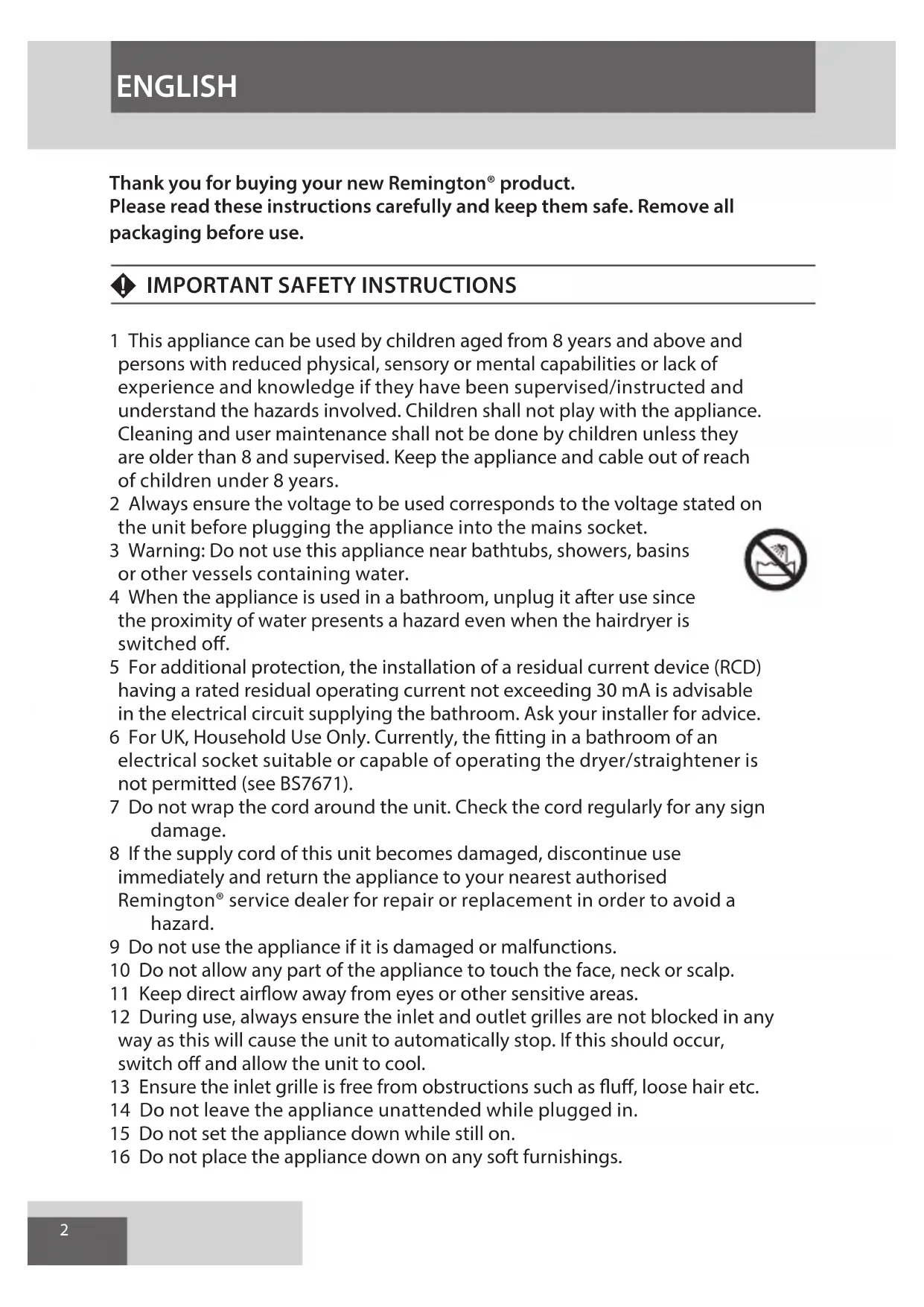 6 For UK, Household Use Only. Currently, the fitting in a bathroom of an electrical socket suitable or capable of operating the dryer/straightener is not permitted (see BS7671).